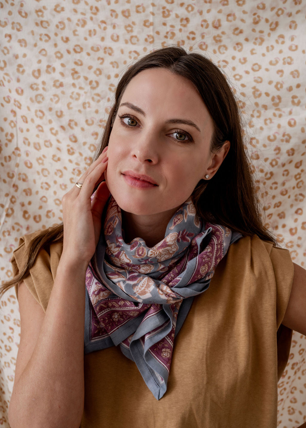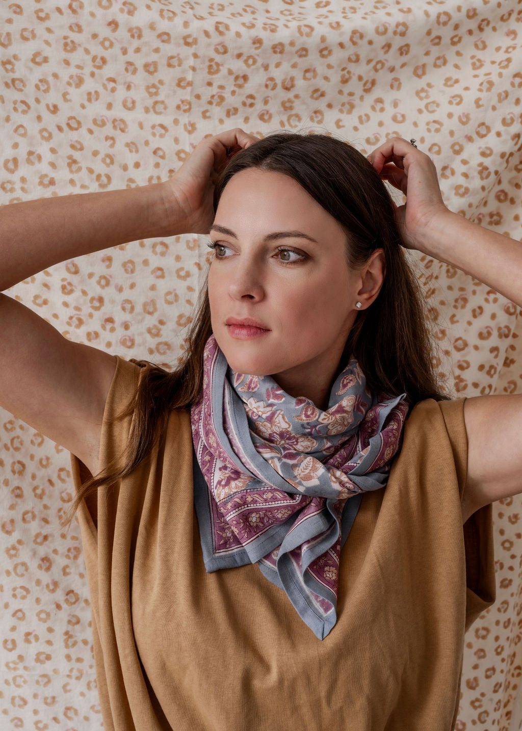 Un grand carré coloré et imprimé à la main sur un tissu doux au toucher peau de pêche qui enveloppera votre cou pour un look bohème, idéal à toute saison !