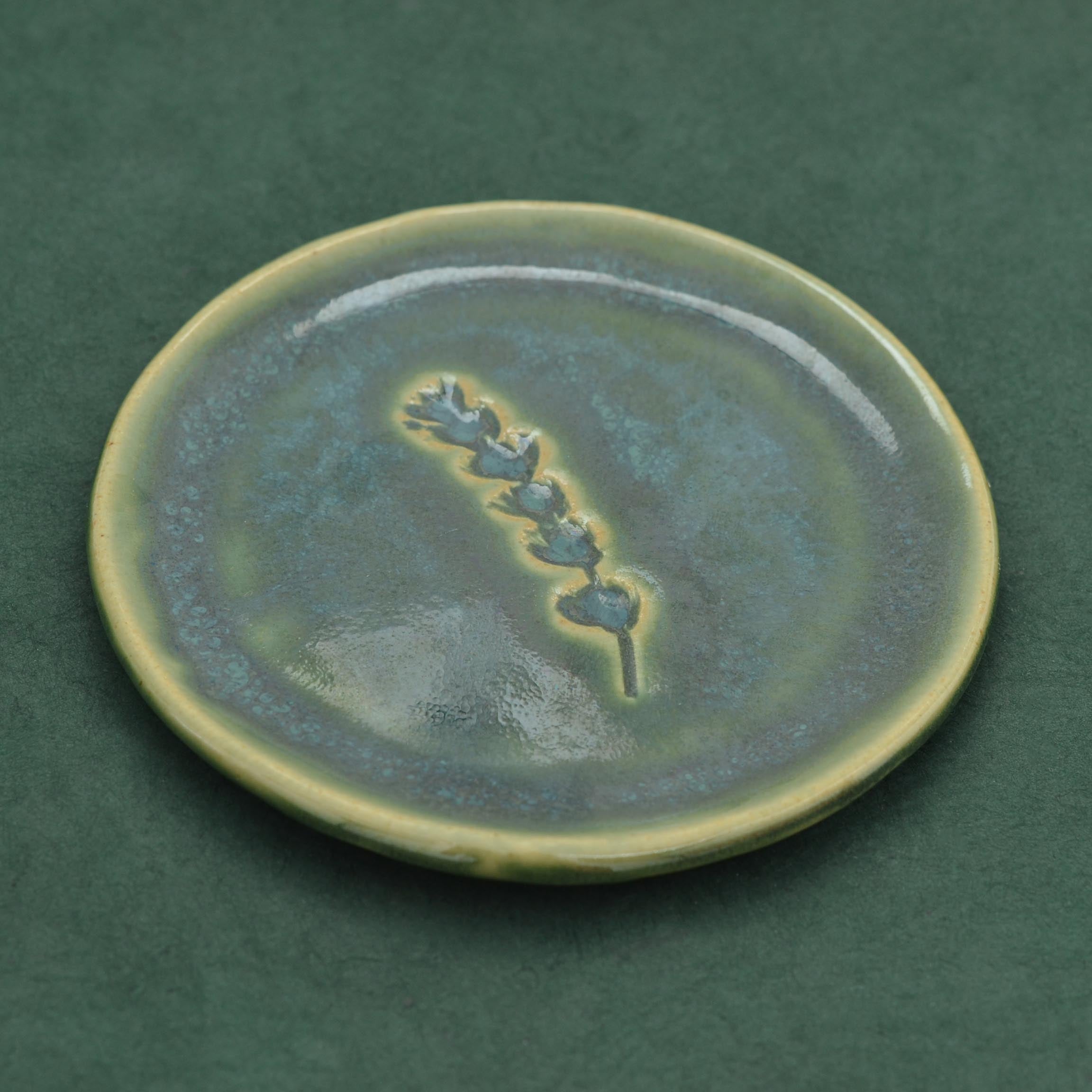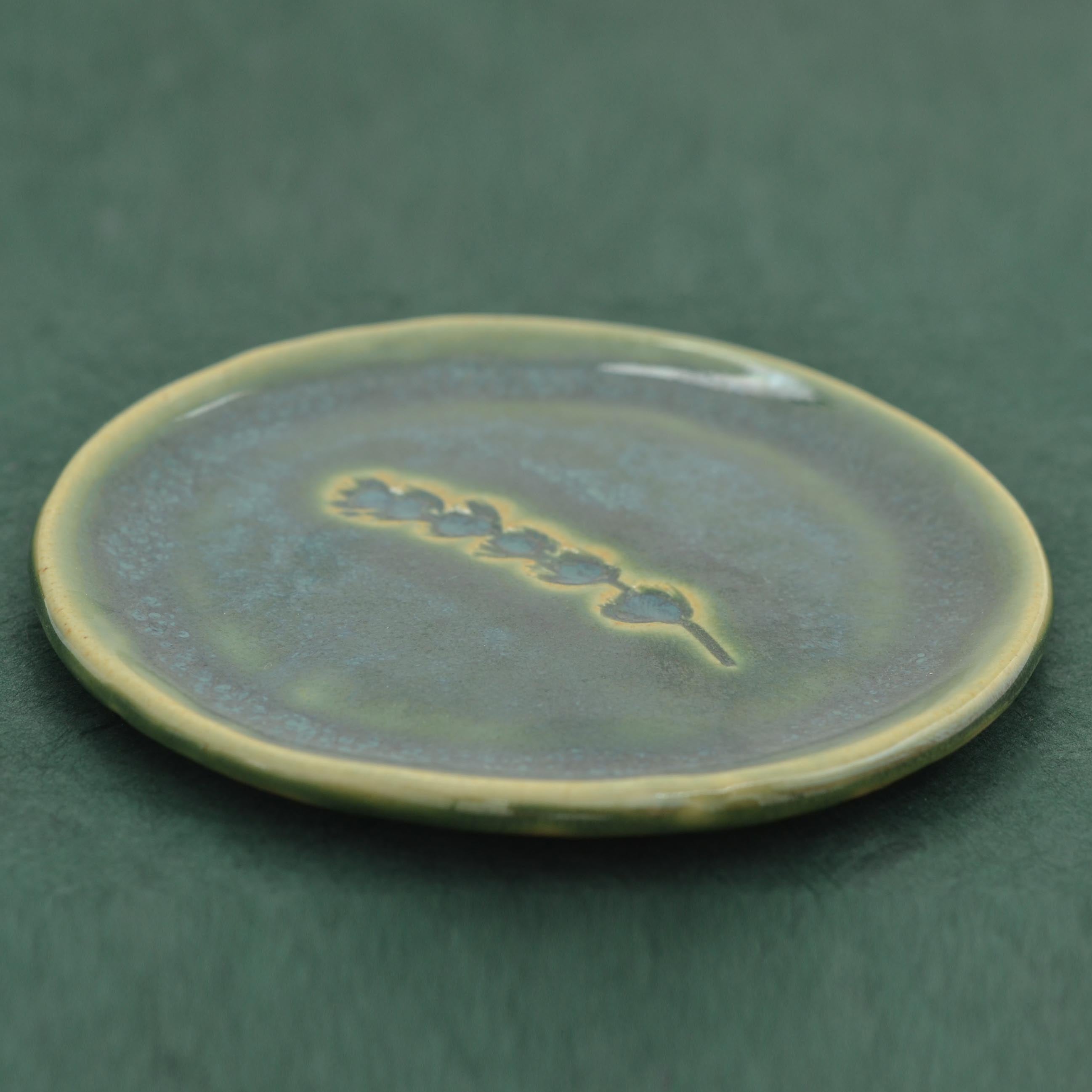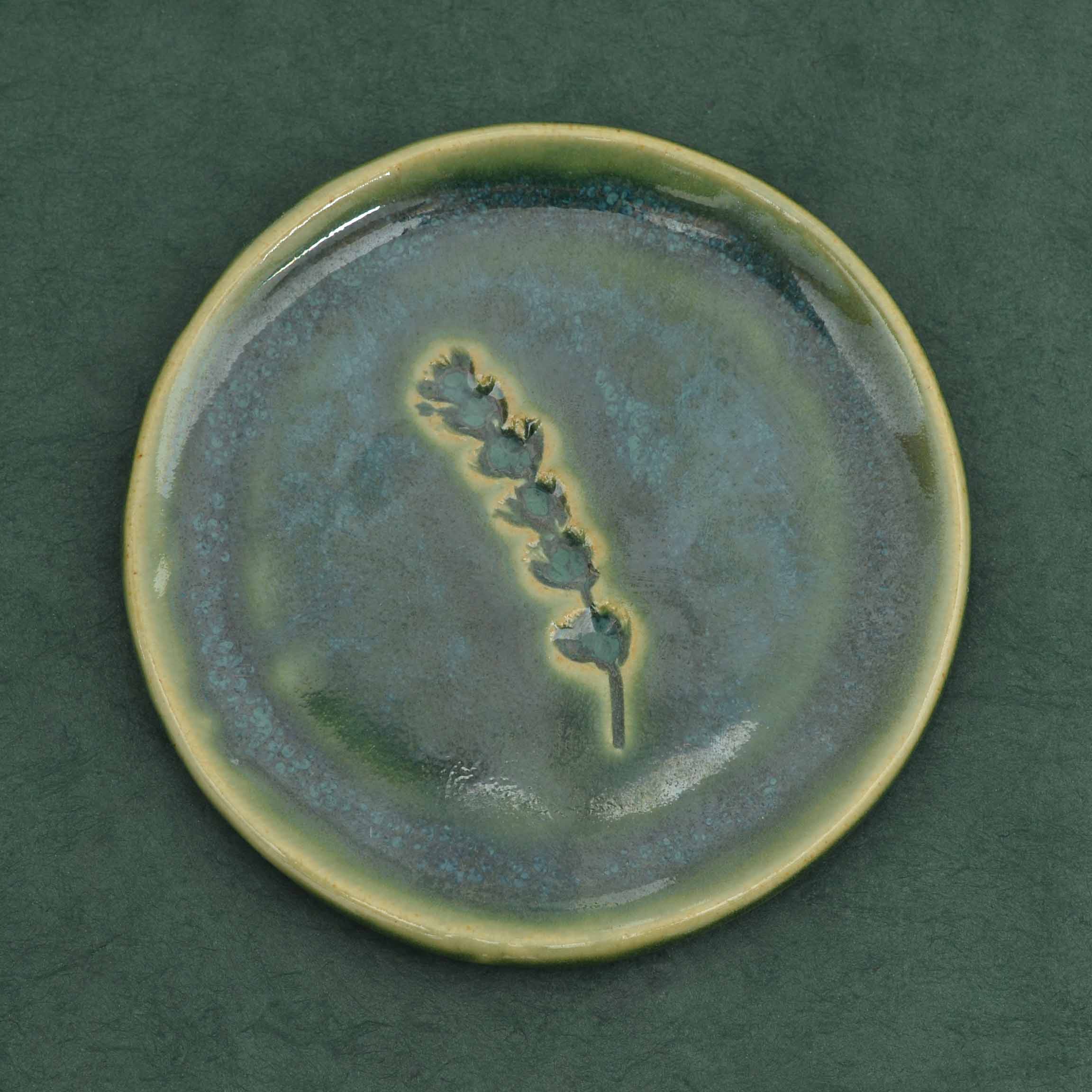 Délicate coupelle en porcelaine, émaillée d'un camaïeu de verts profonds, façonnée à la main par la créatrice dans son atelier provençal. Au centre, une délicate empreinte de lavande vient révéler un jeu de nuances et de textures qui lui confère un charme authentique et un parfum de Provence.