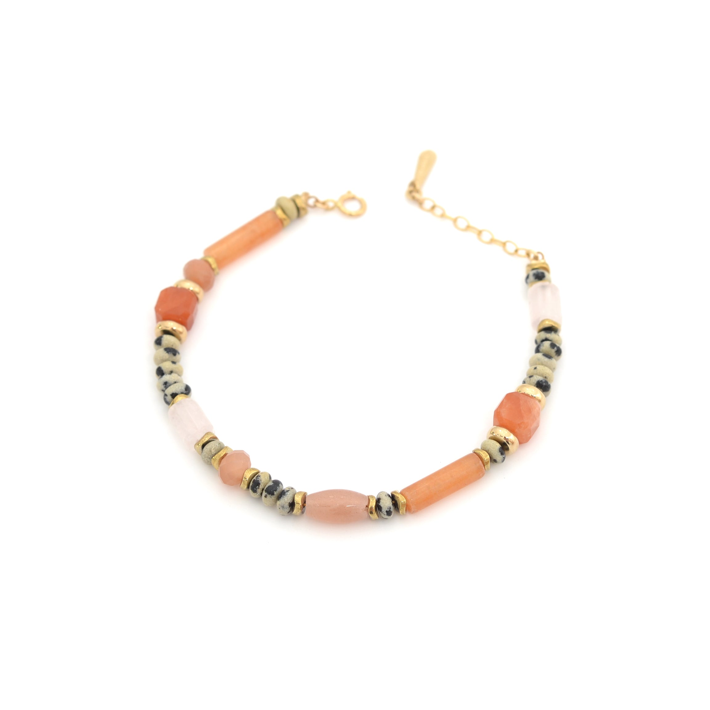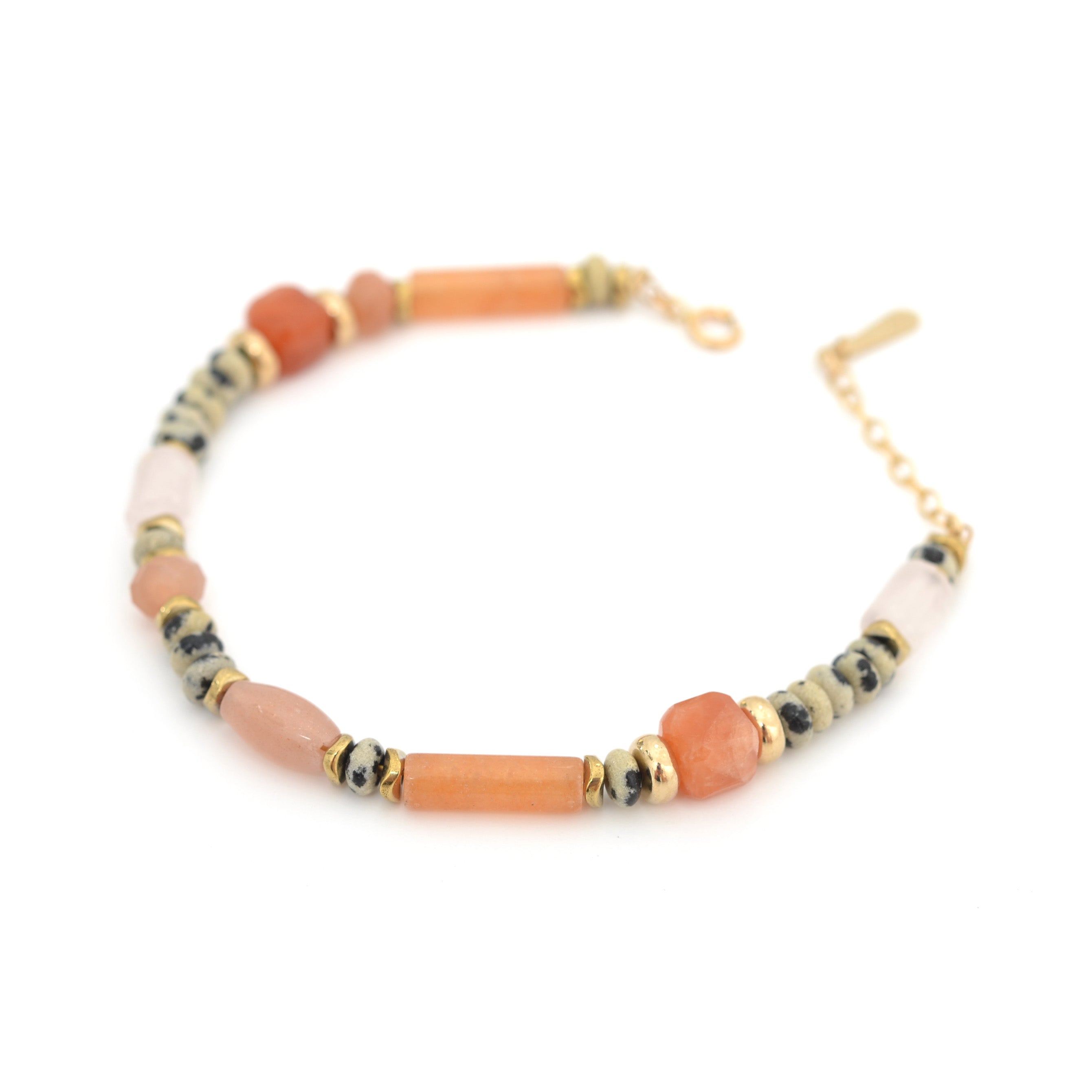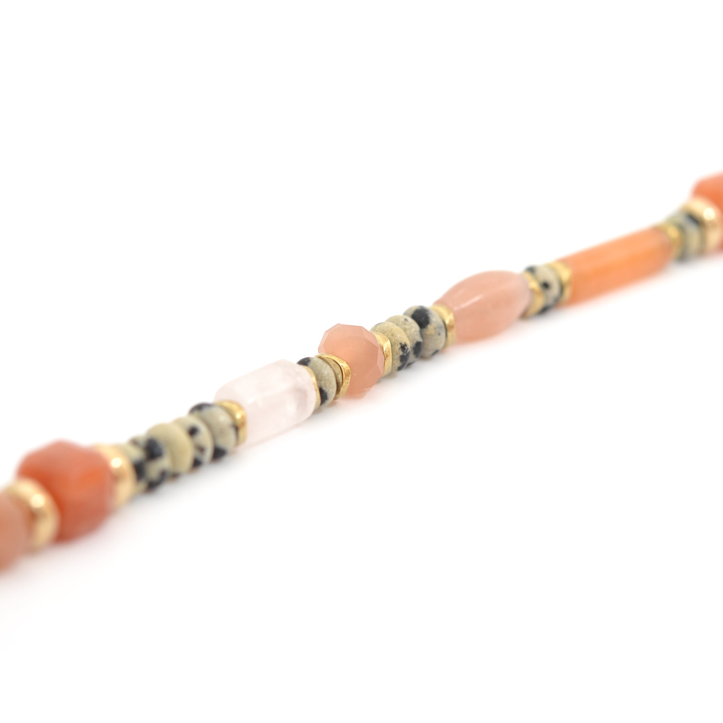 Un bracelet composé d'une multitude de pierres naturelles au mariage de couleurs harmonieux : quartz rose, jaspe dalmatien, un mélange rare qui fait de chaque pièce une création singulière.
