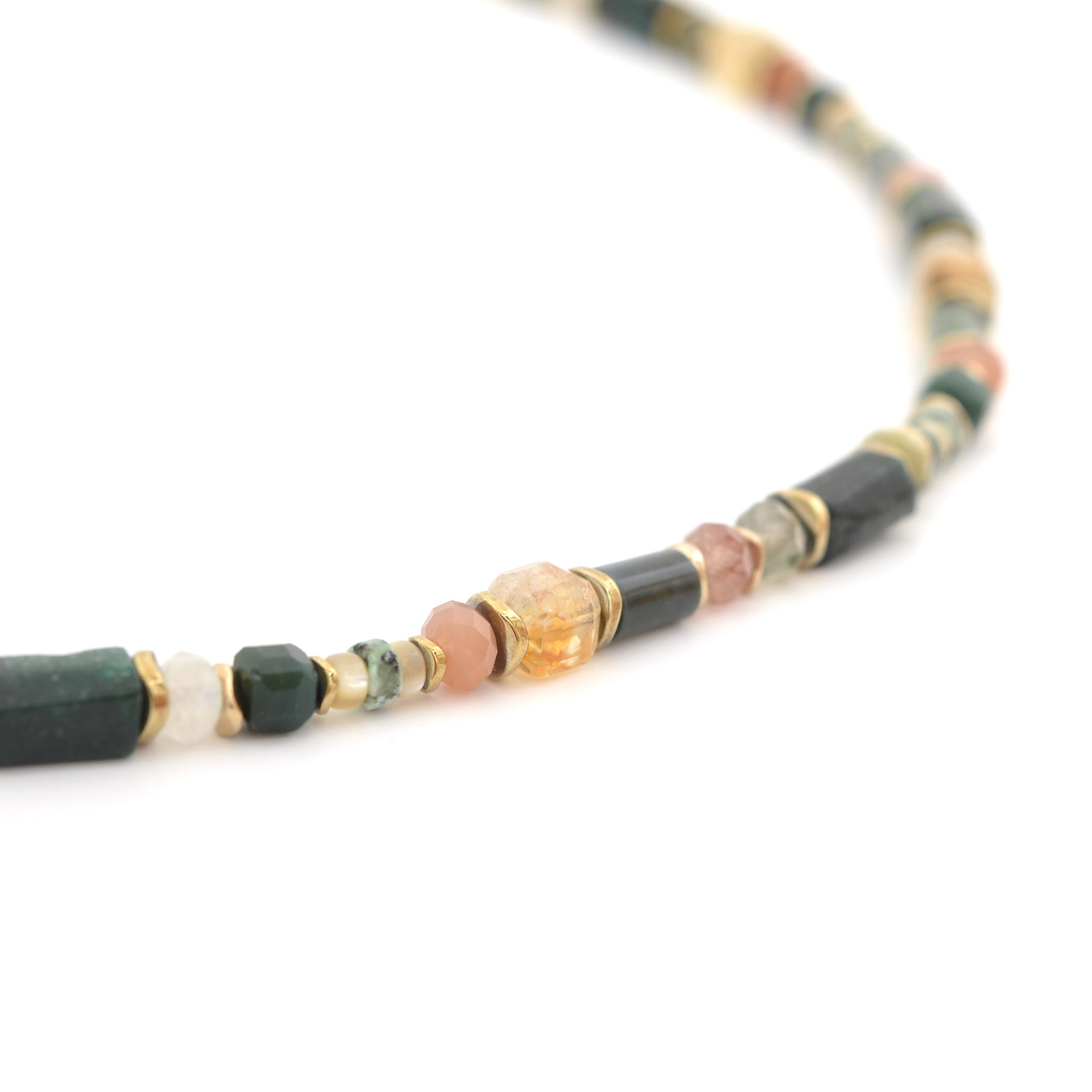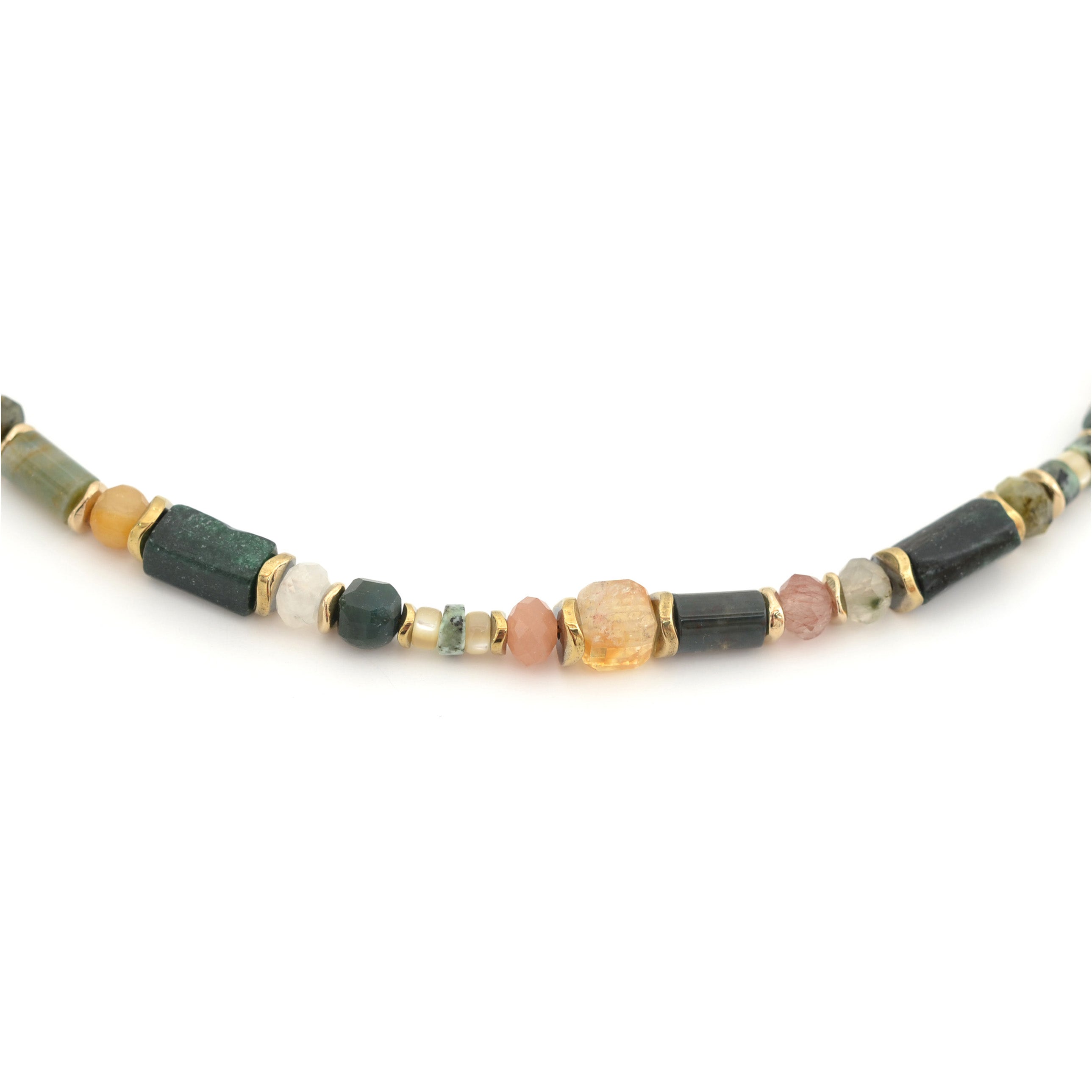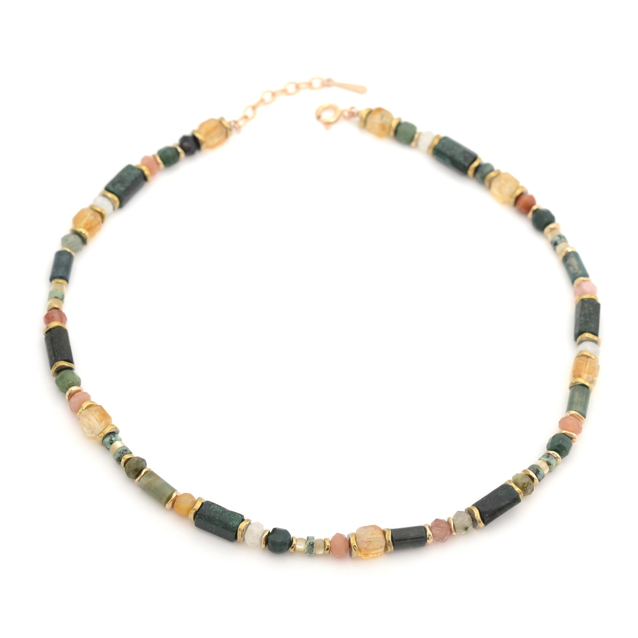 Sublime collier composé de pierres naturelles aux nuances profondes : vert sombre, rose tendres et miel doré. L'harmonie de ces pierres semi-précieuses, aux formes multiples, crée un bijou raffiné et lumineux, idéal pour sublimer votre décolleté.