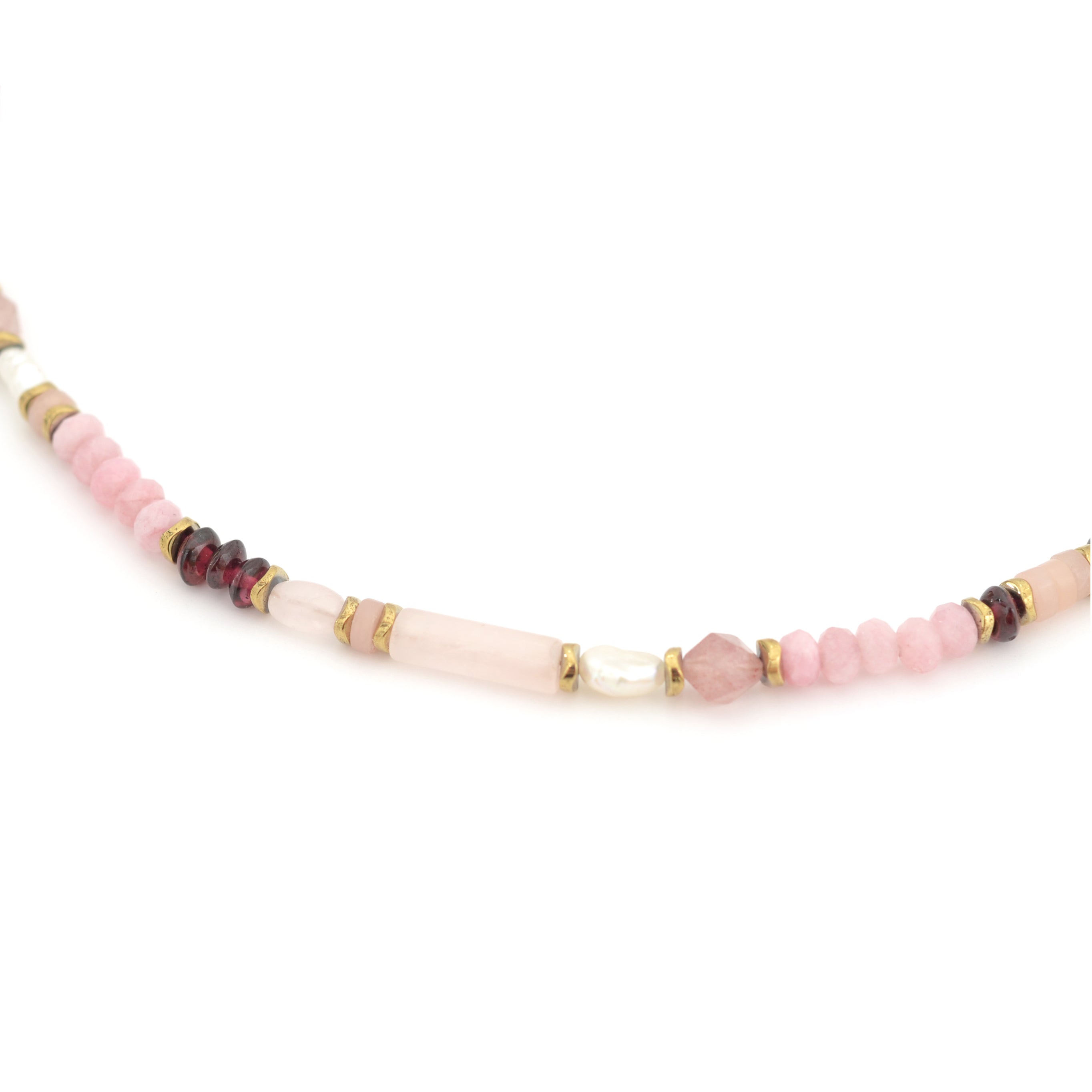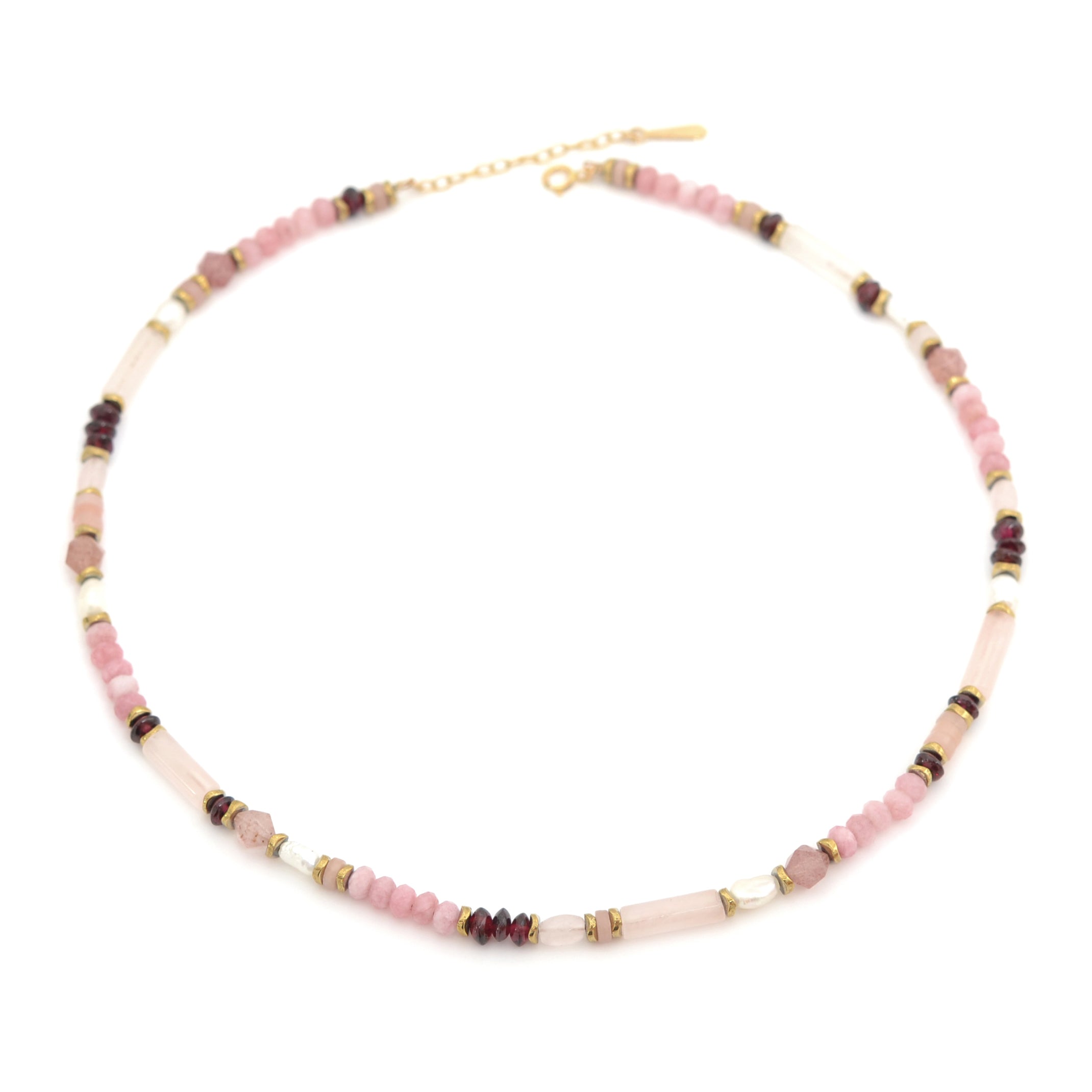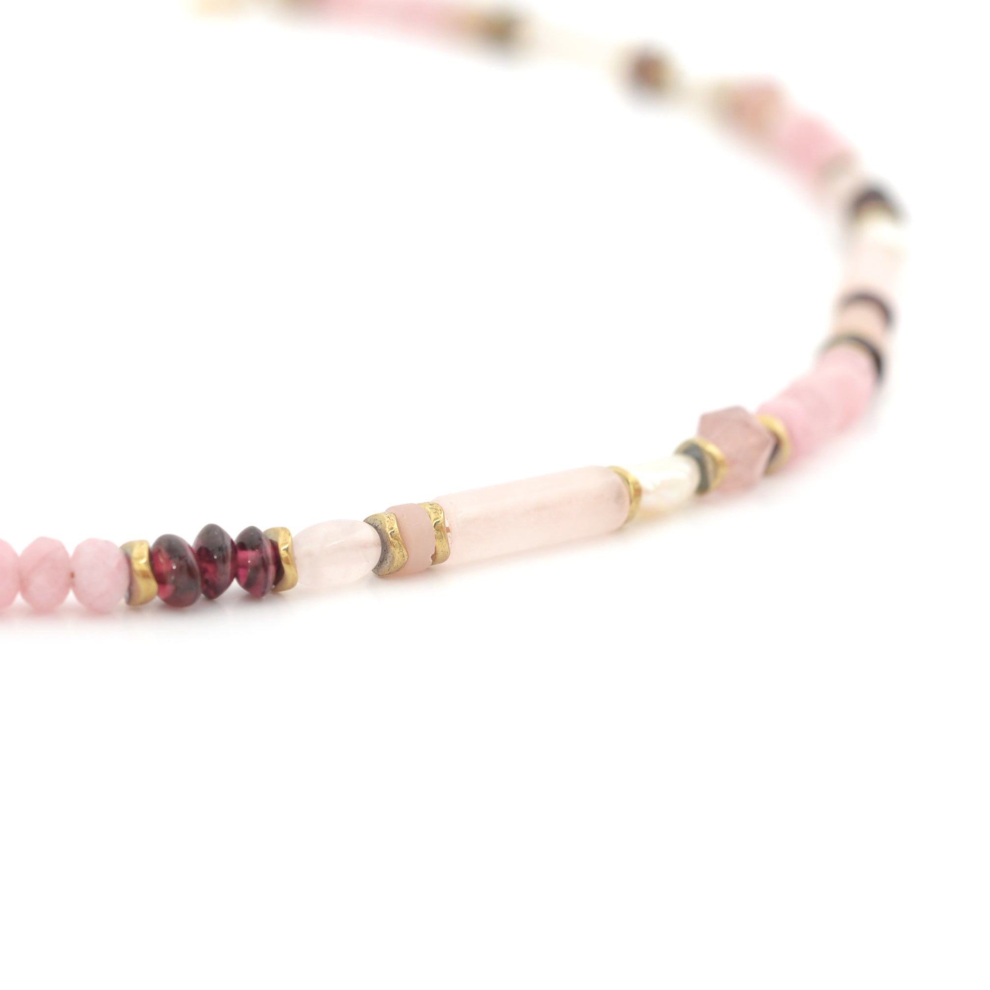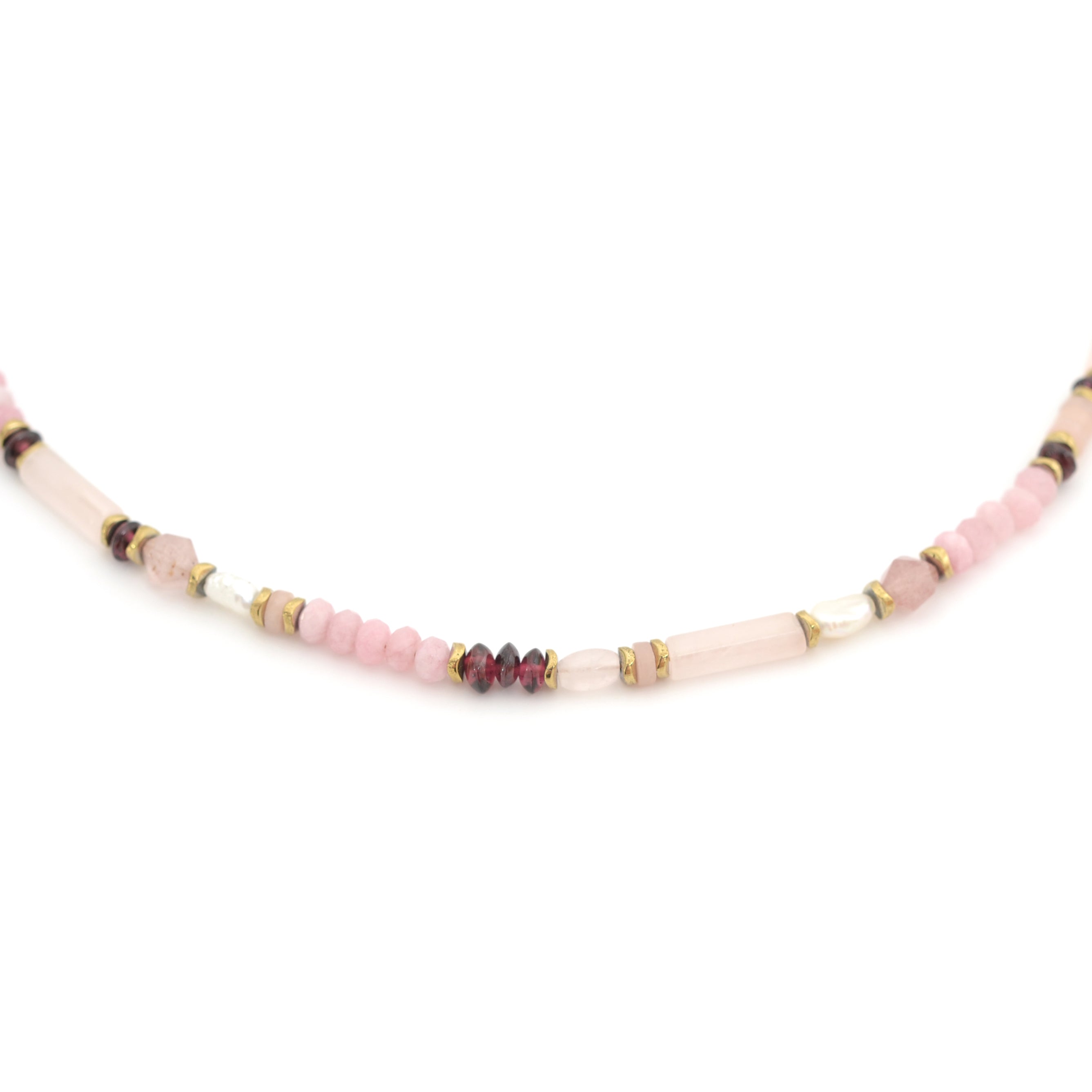 Ravissant collier composé de multiples pierres naturelles sélectionnées soigneusement afin de former un pétillant camaïeu de rose.