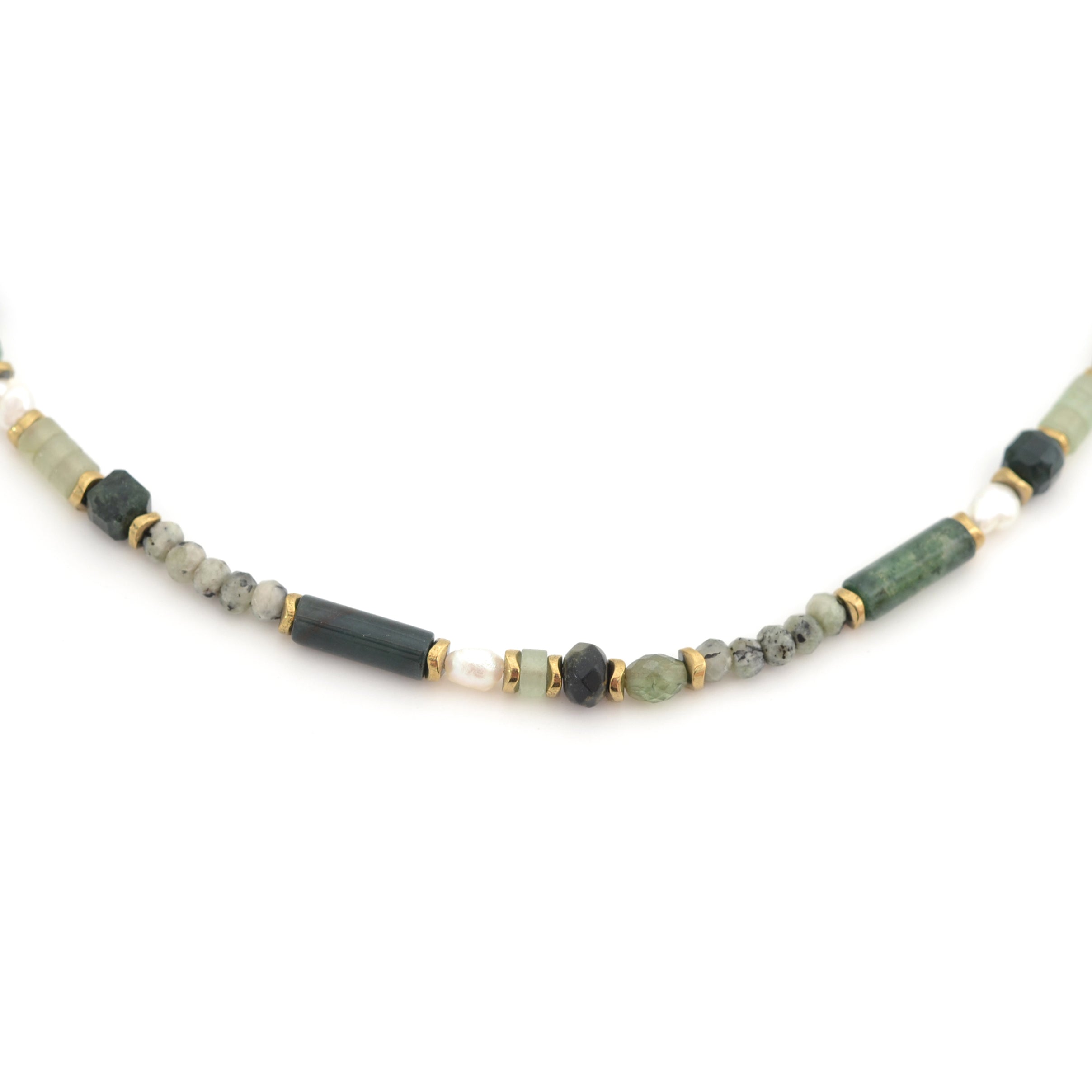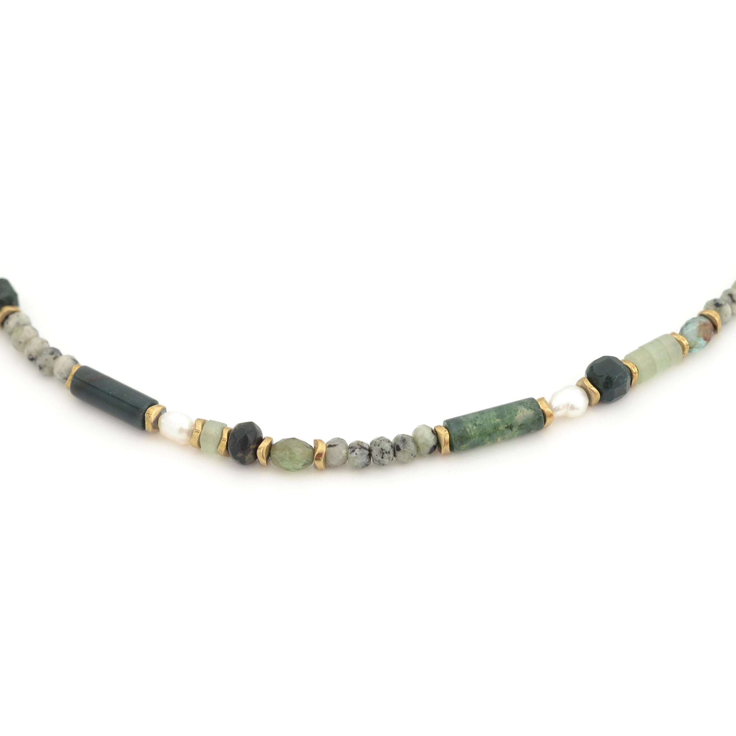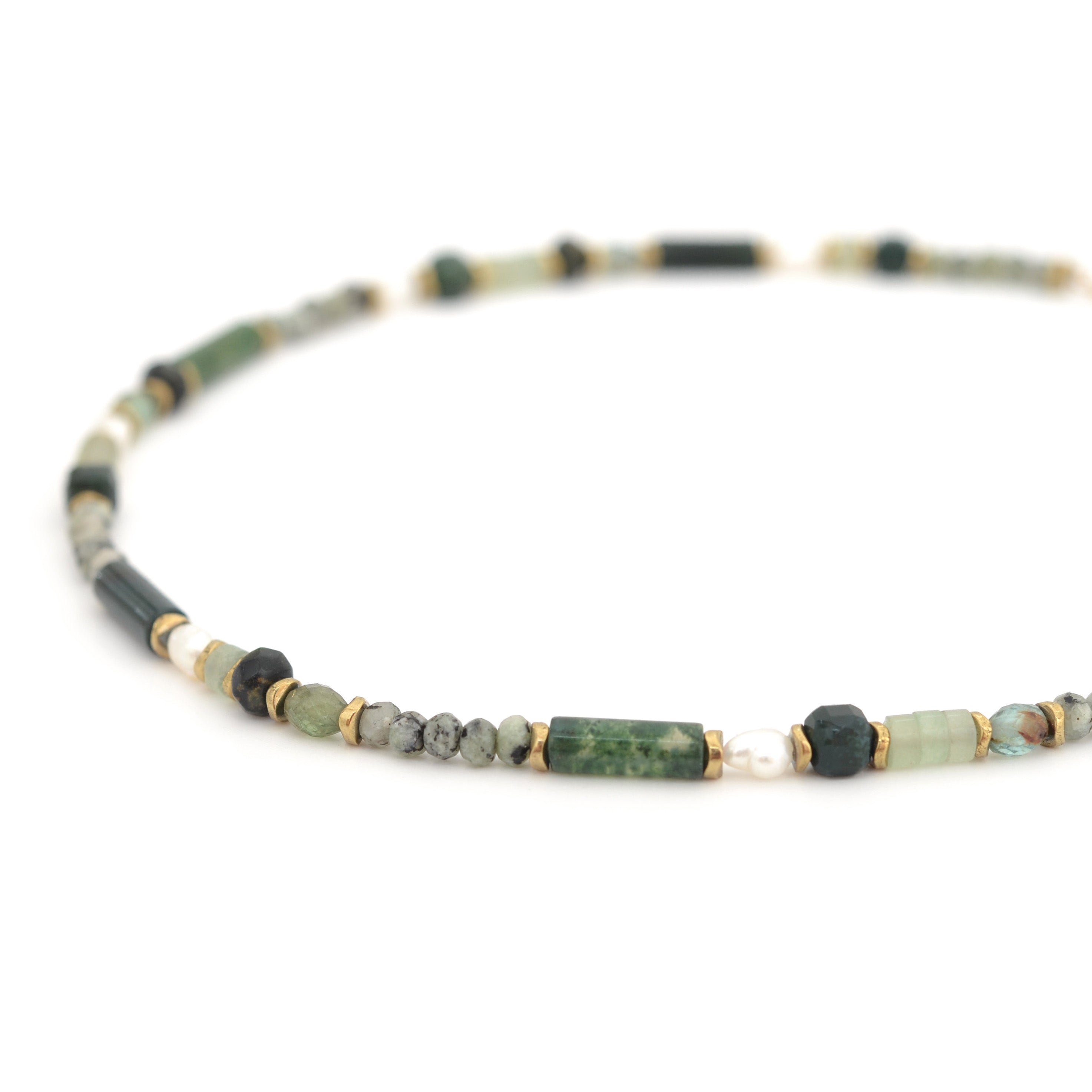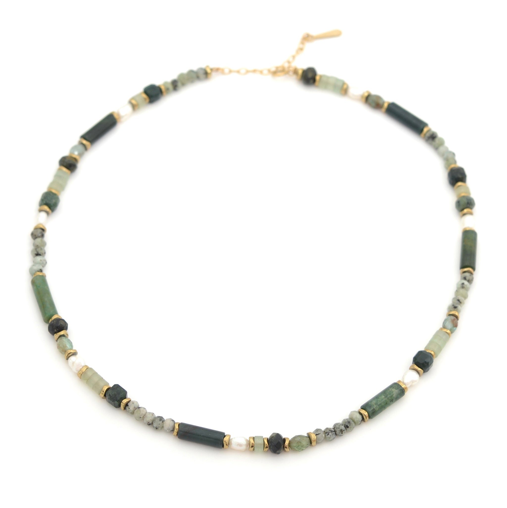 Ravissant collier composé de multiples pierres naturelles sélectionnées soigneusement afin de former un profond camaïeu de vert.