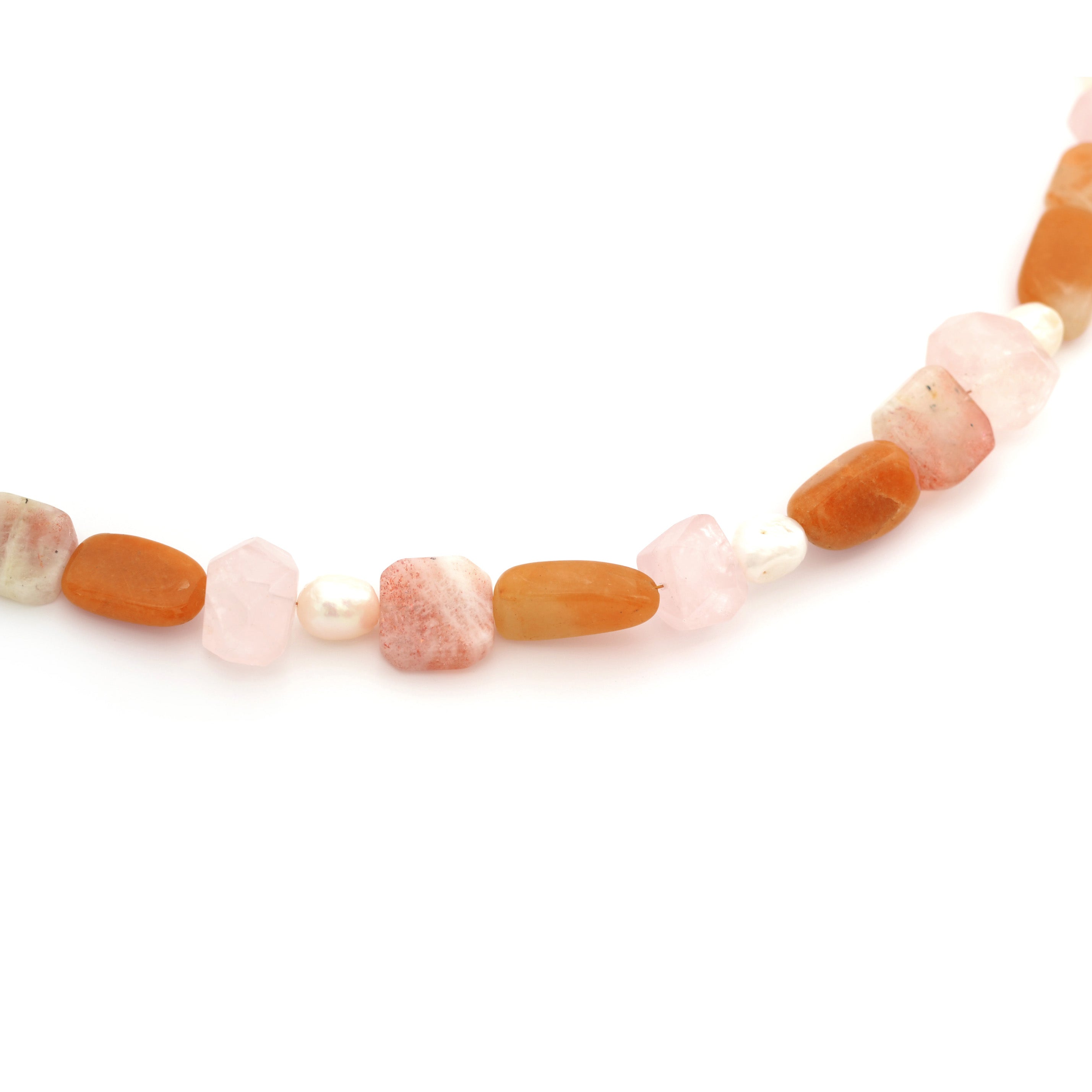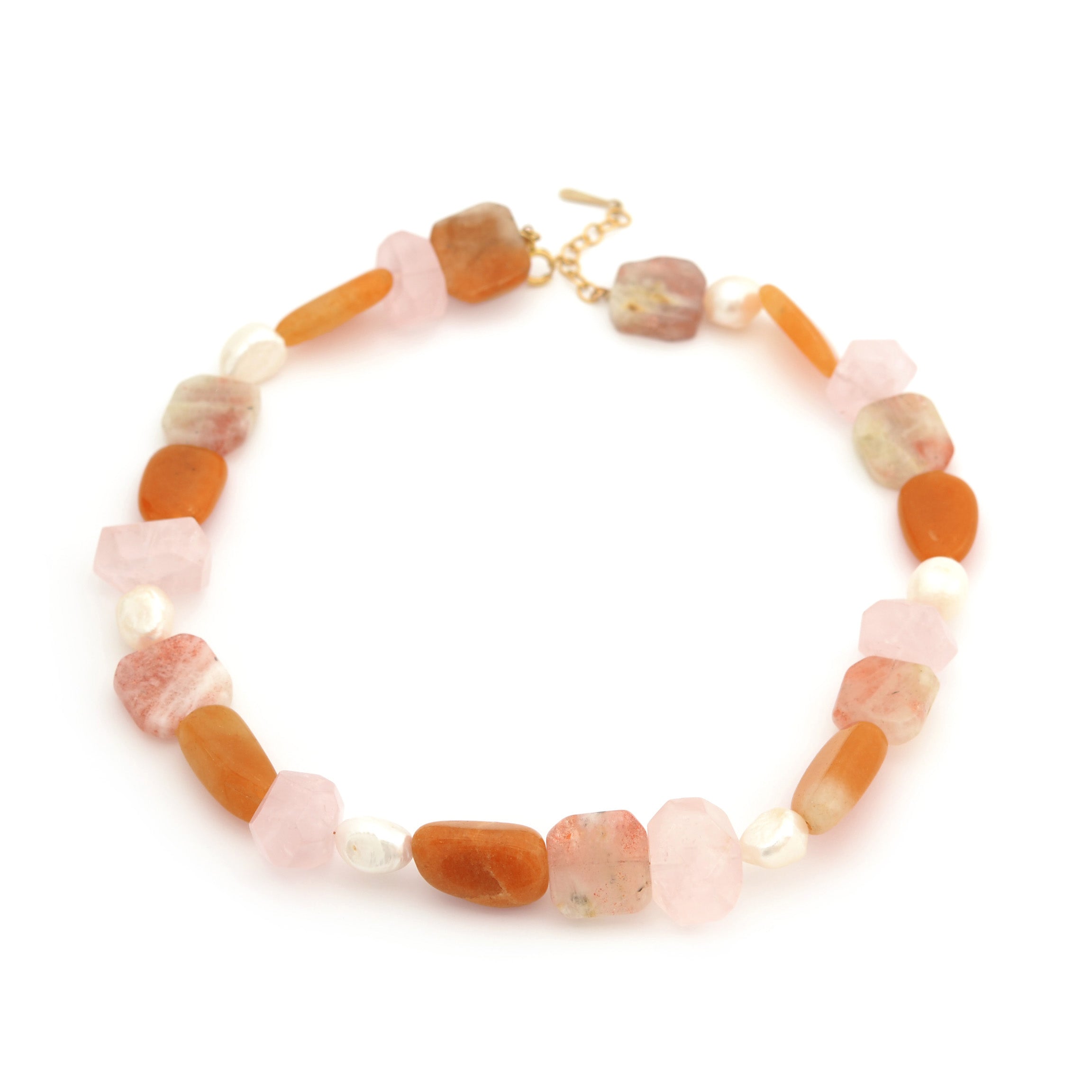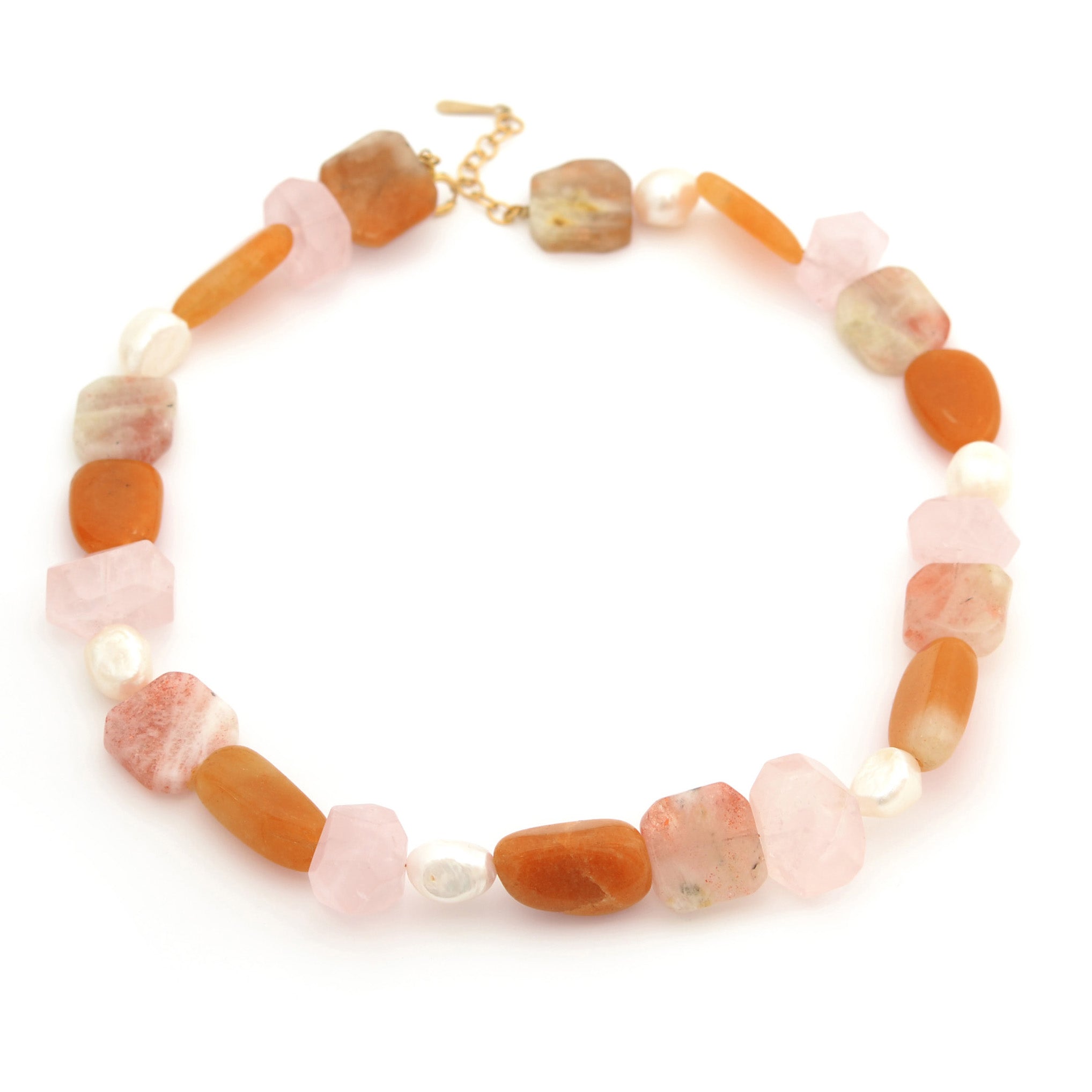 Majestueux collier composé de pierres naturelles à l'aspect brut. Quartz rose, cornaline, perle d'eau douce et pierre de lune orangée se mêlent harmonieusement pour créer un bijou unique, vibrant et audacieux.