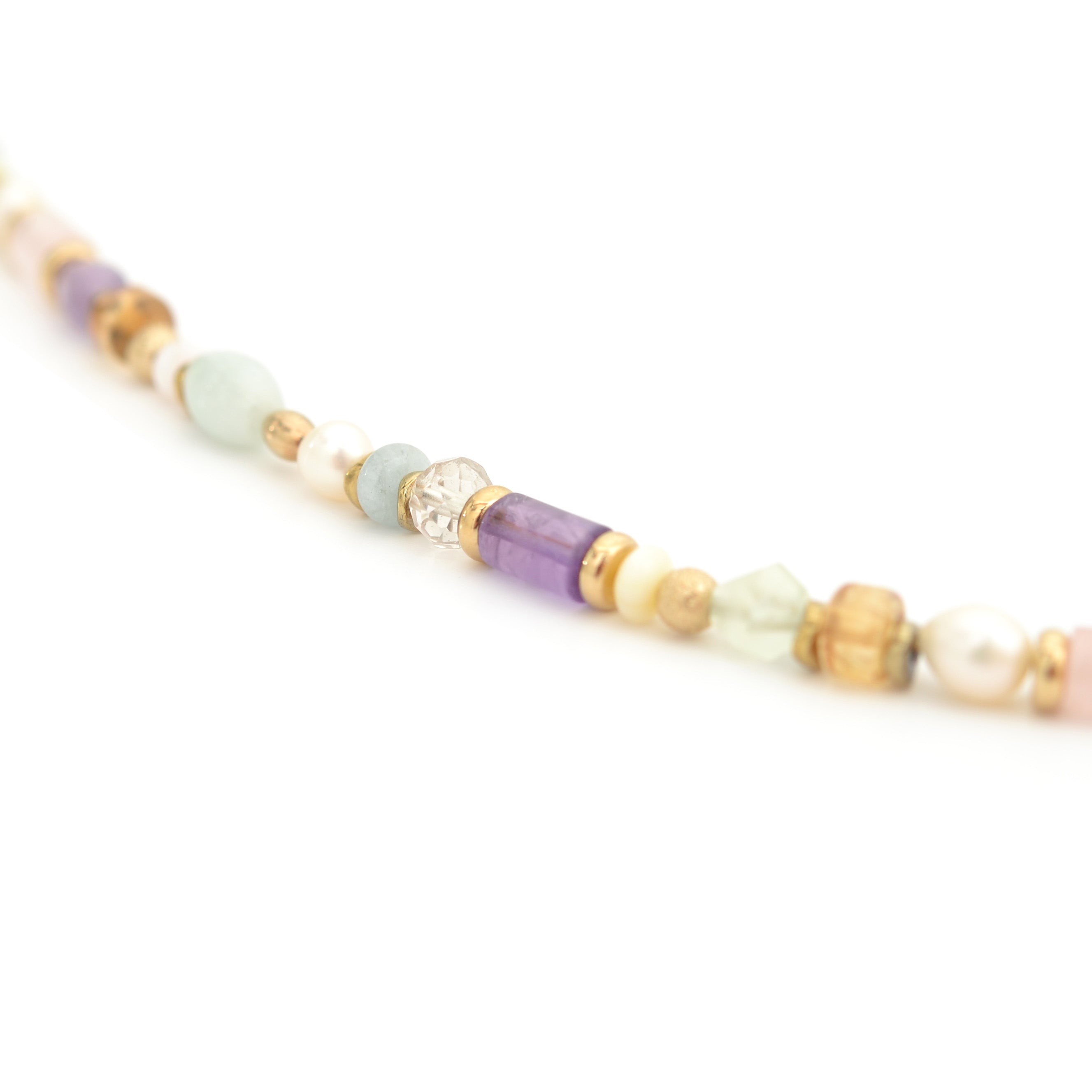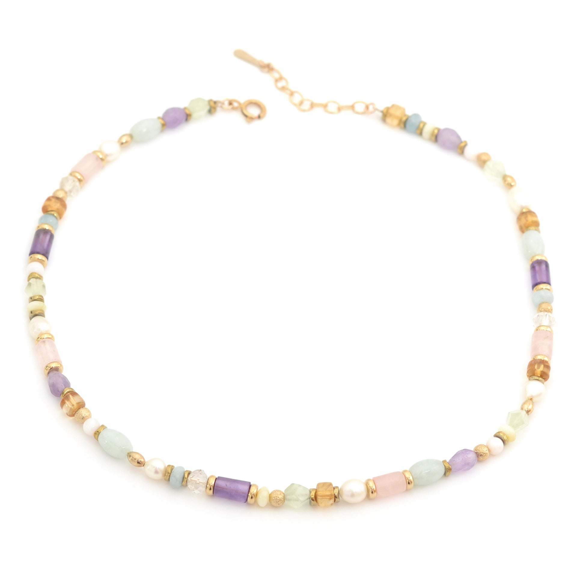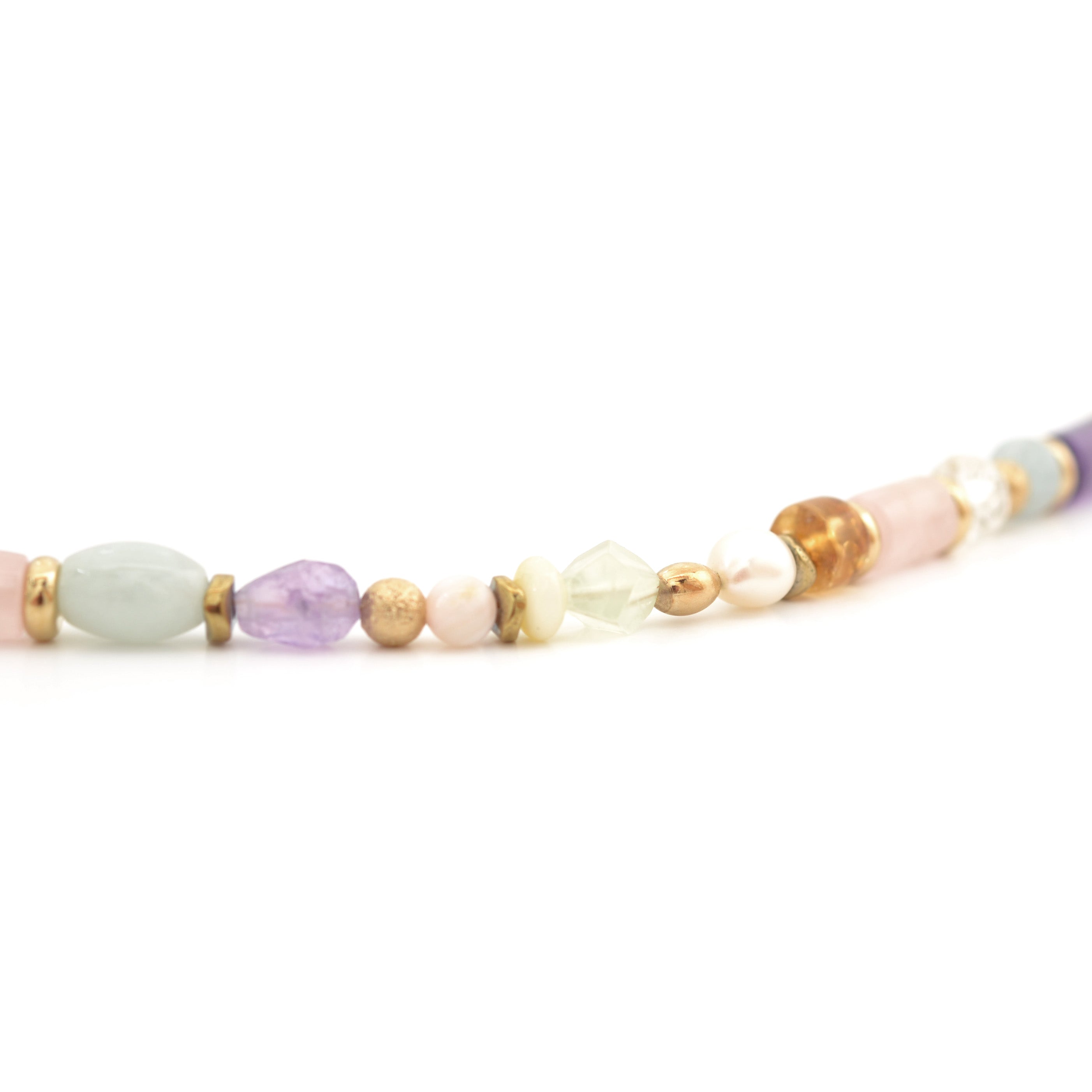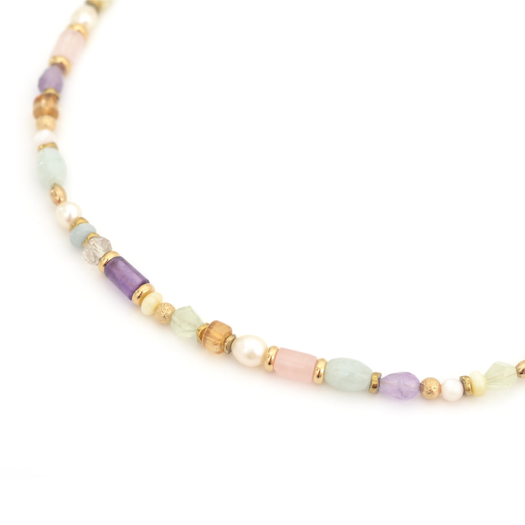 Un collier empreint de douceur, mêlant des pierres naturelles aux teintes pastelles : quartz rose, aventurine, citrine, perle, nacre blanche et rose, préhnite, quartz rutile, aigue marine et améthyste. Un bijou délicat qui capture la lumière avec finesse.