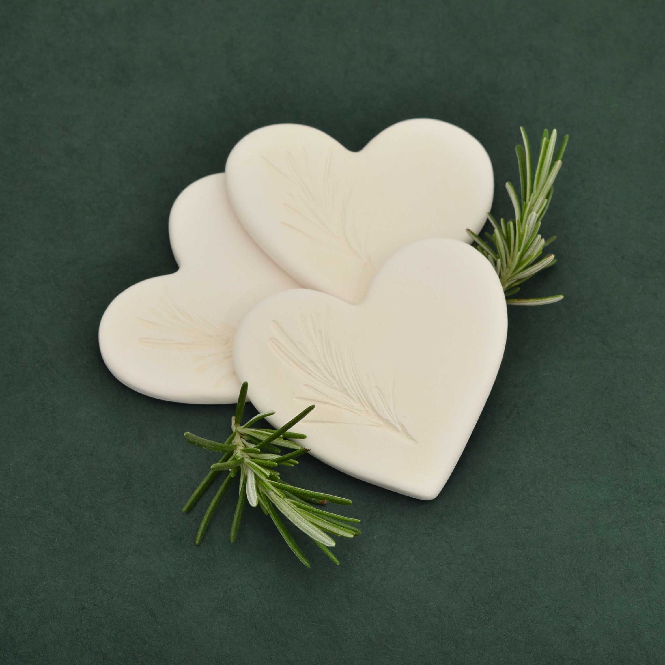 Entièrement façonné à la main par la créatrice dans son atelier provençal, ce palet en porcelaine en forme de cœur est marqué d'une délicate empreinte de romarin.