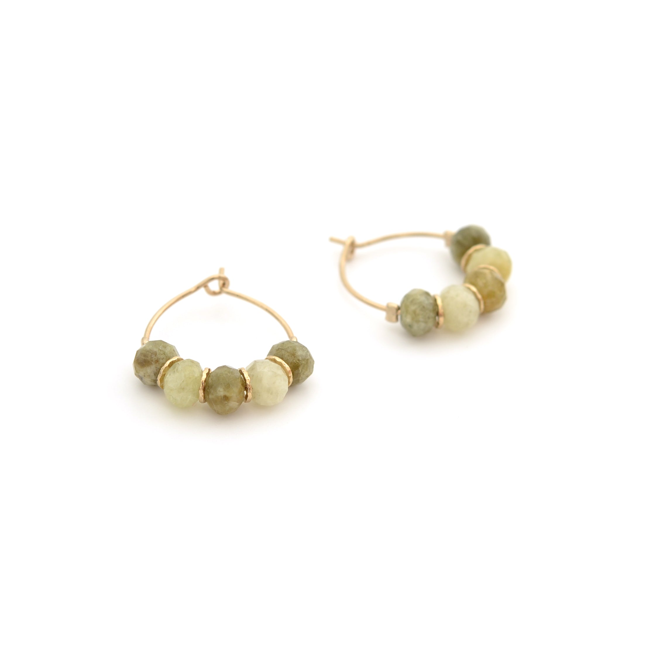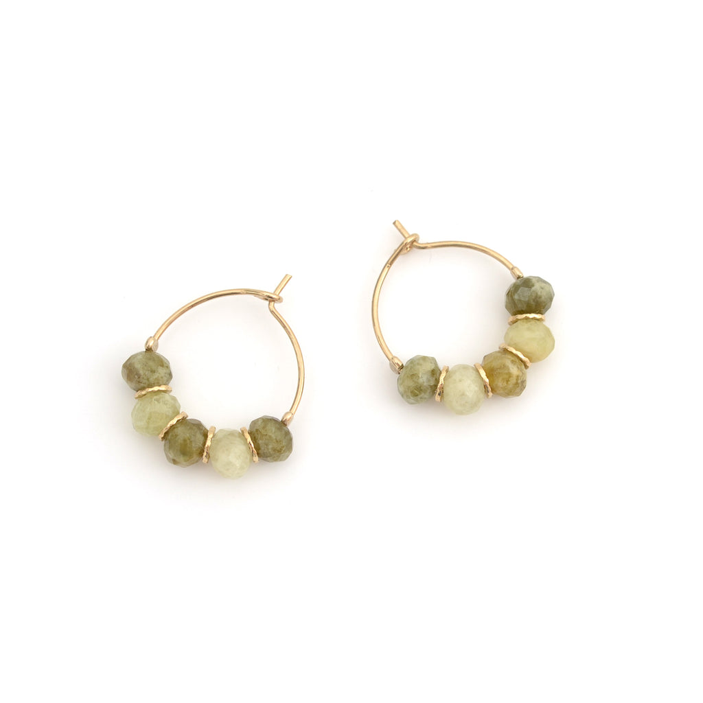 De fines créoles dorées ornées de pierres naturelles au camaïeu de verts doux. Une paire lumineuse et intemporelle qui sublime vos tenues.
