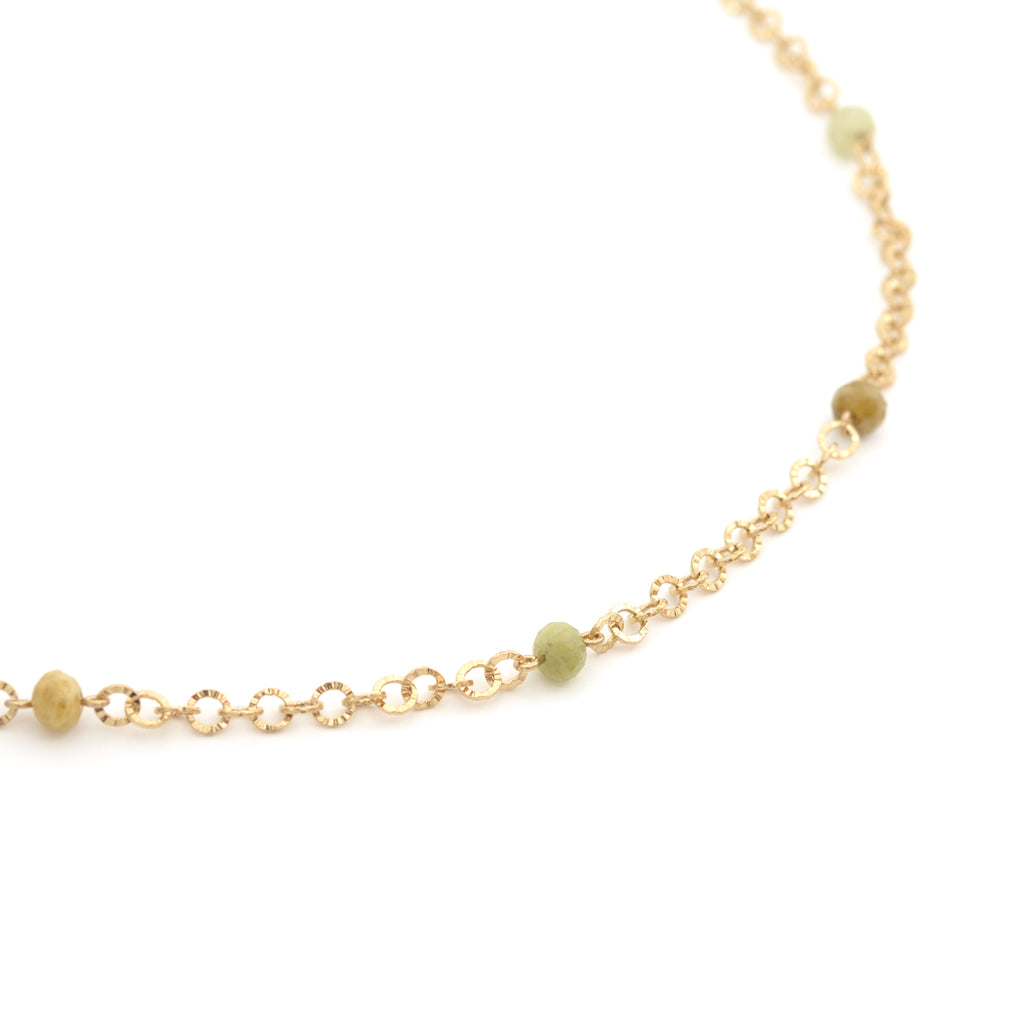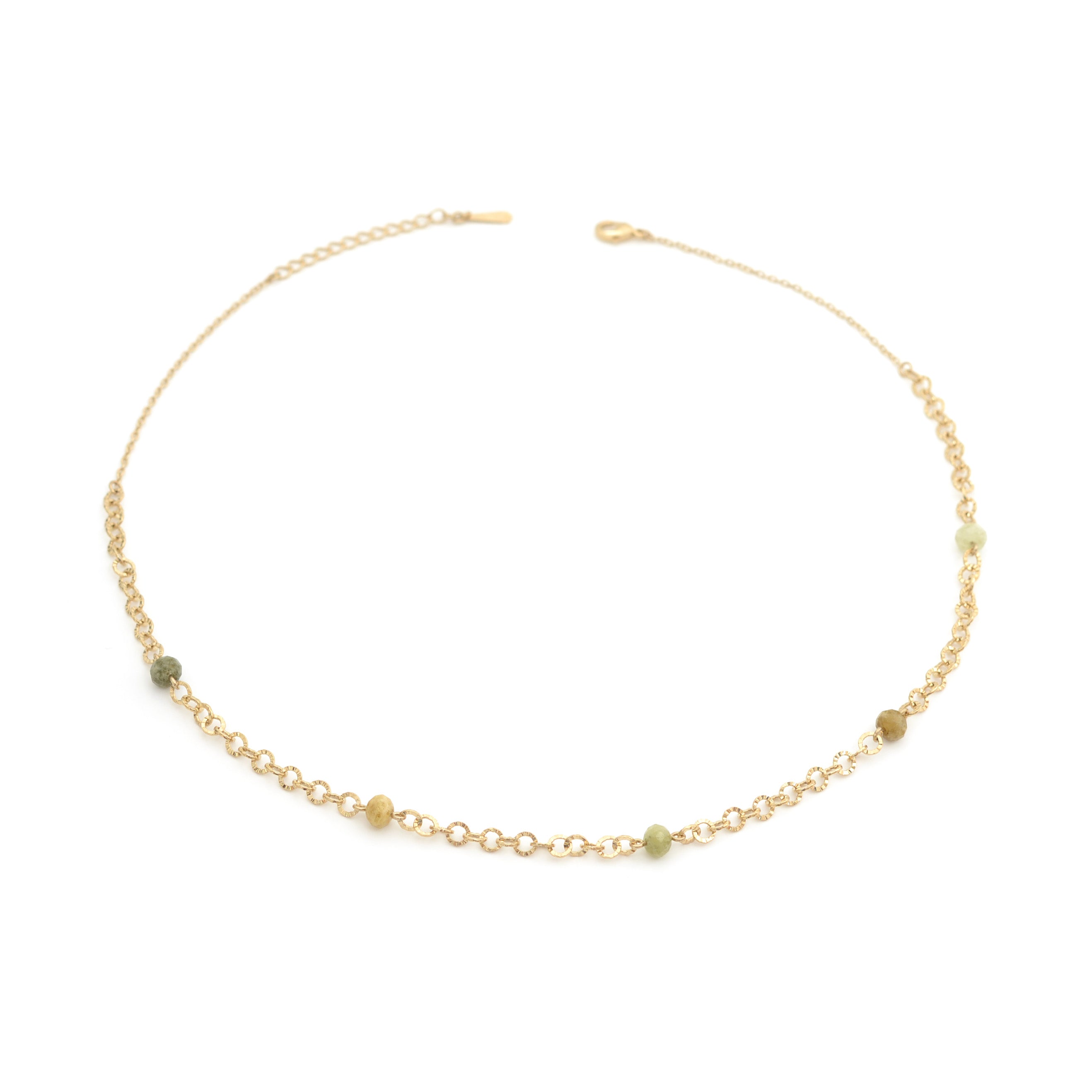 Elégant collier composé d'une chaine aux maillons délicatement ondulés et ponctuée de grenats verts naturels aux nuances douces. Lumineux, il apporte une touche de féminité à vos tenues.