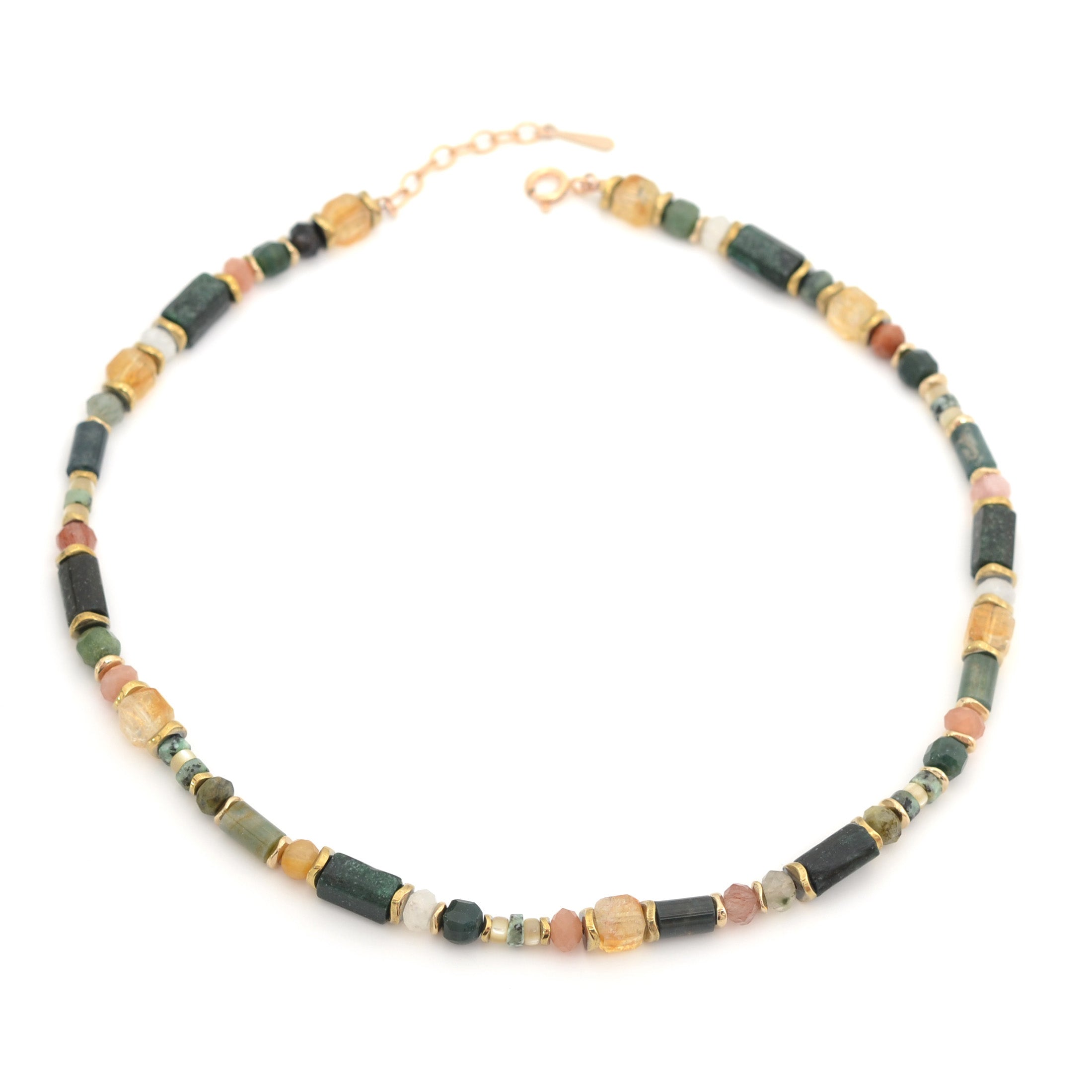 Sublime collier composé de pierres naturelles aux nuances profondes : vert sombre, rose tendres et miel doré. L'harmonie de ces pierres semi-précieuses, aux formes multiples, crée un bijou raffiné et lumineux, idéal pour sublimer votre décolleté.