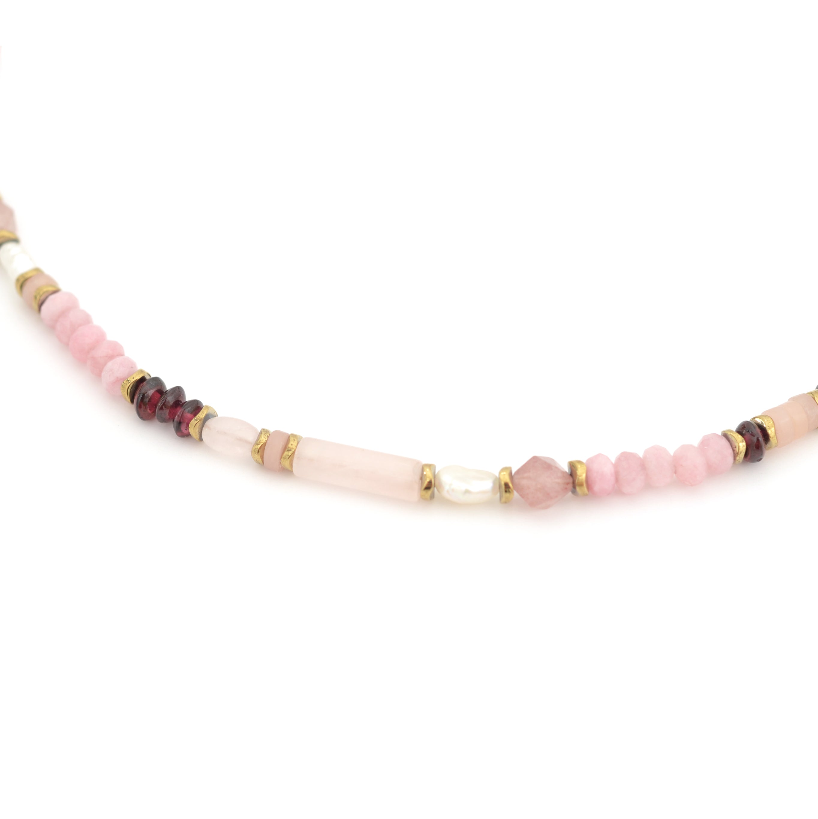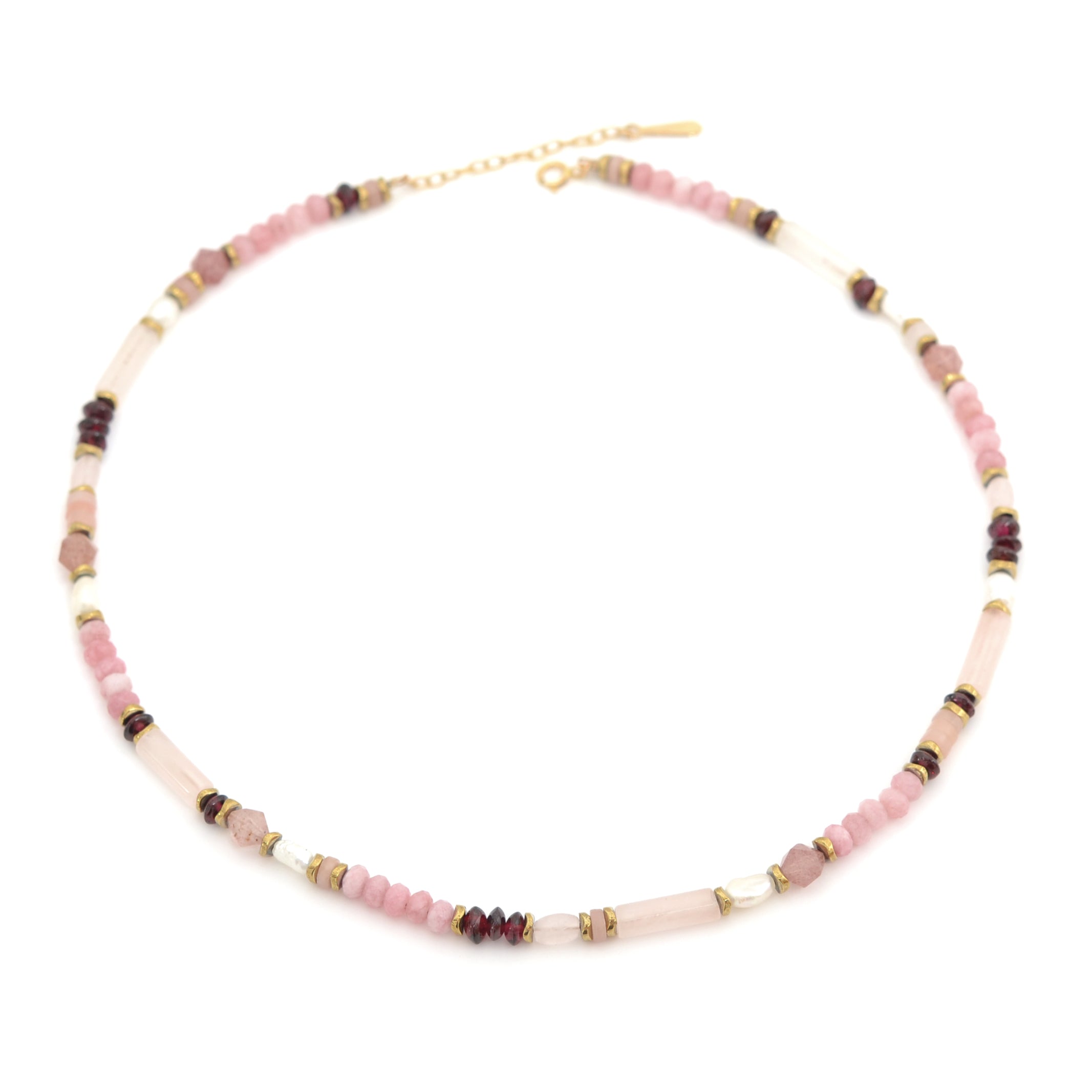 Ravissant collier composé de multiples pierres naturelles sélectionnées soigneusement afin de former un pétillant camaïeu de rose.