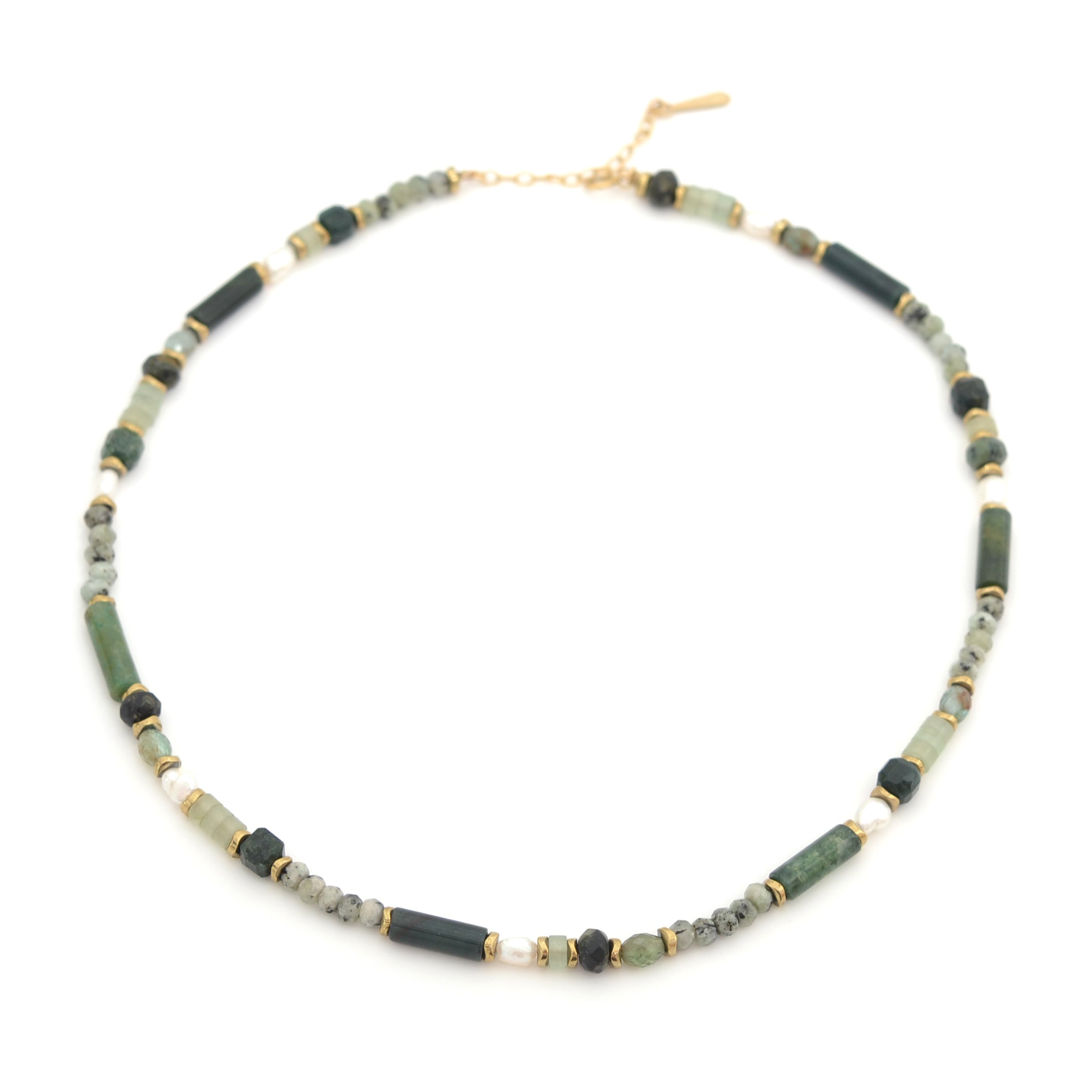 Ravissant collier composé de multiples pierres naturelles sélectionnées soigneusement afin de former un profond camaïeu de vert.