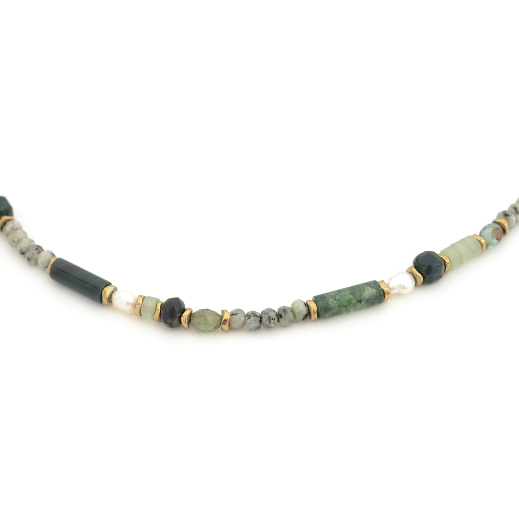 Bijou en or laminé 585/1000 (gold-filled) et pierre semi-précieuses (agate mousse, jaspe africain, aventurine, apatite et perle d'eau douce).