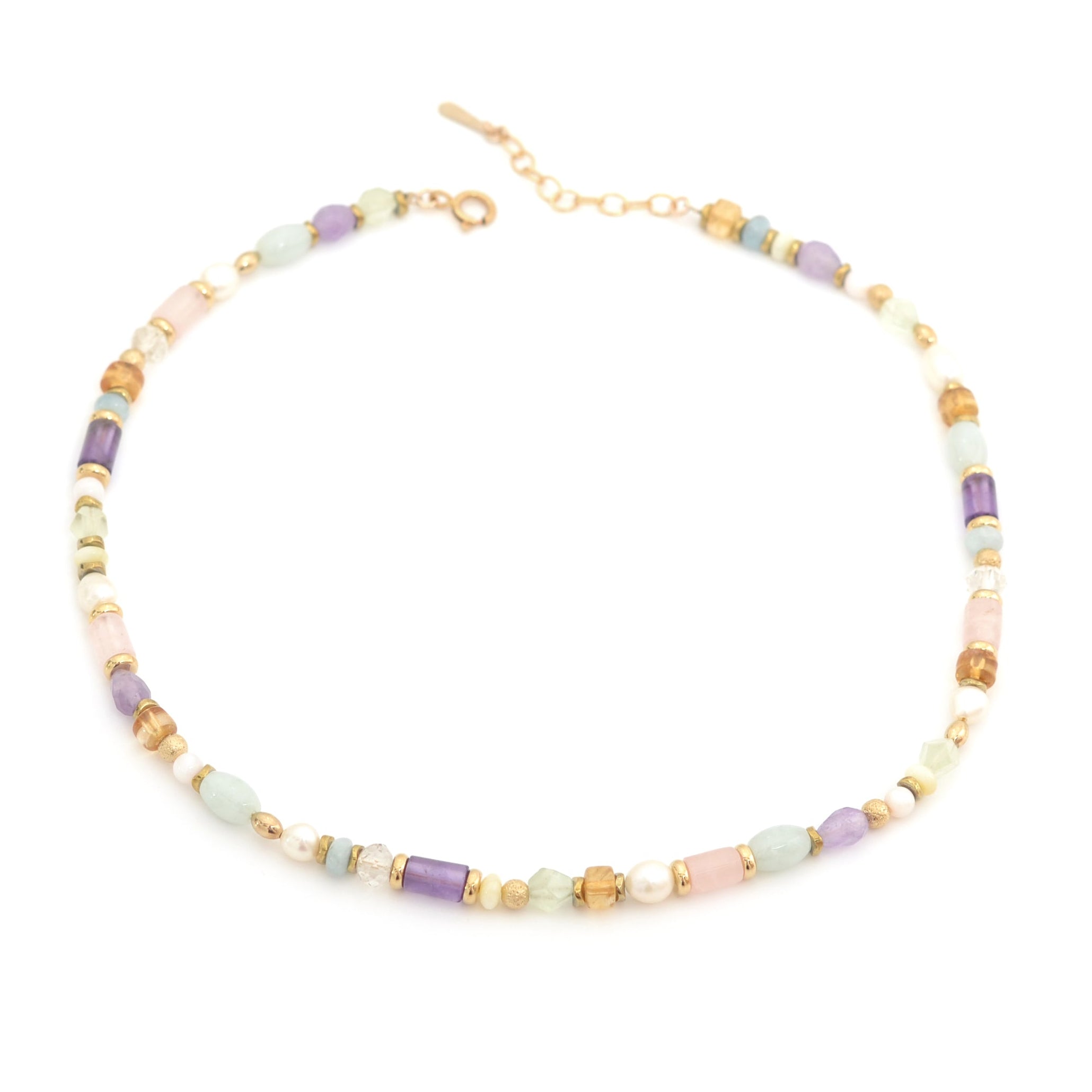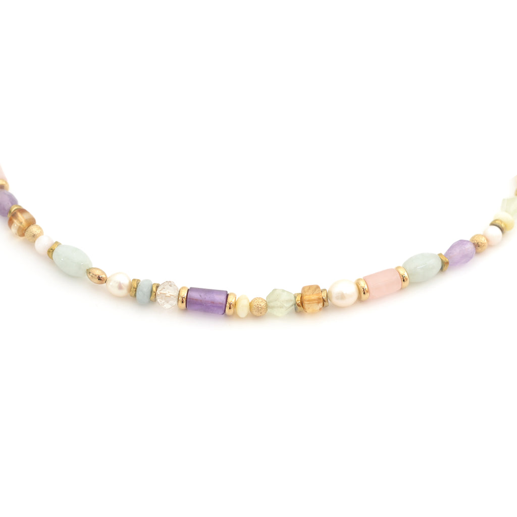 Un collier empreint de douceur, mêlant des pierres naturelles aux teintes pastelles : quartz rose, aventurine, citrine, perle, nacre blanche et rose, préhnite, quartz rutile, aigue marine et améthyste. Un bijou délicat qui capture la lumière avec finesse.