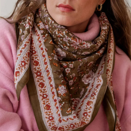 Un grand carré coloré et imprimé à la main sur un tissu doux au toucher peau de pêche qui enveloppera votre cou pour un look bohème, idéal à toute saison !