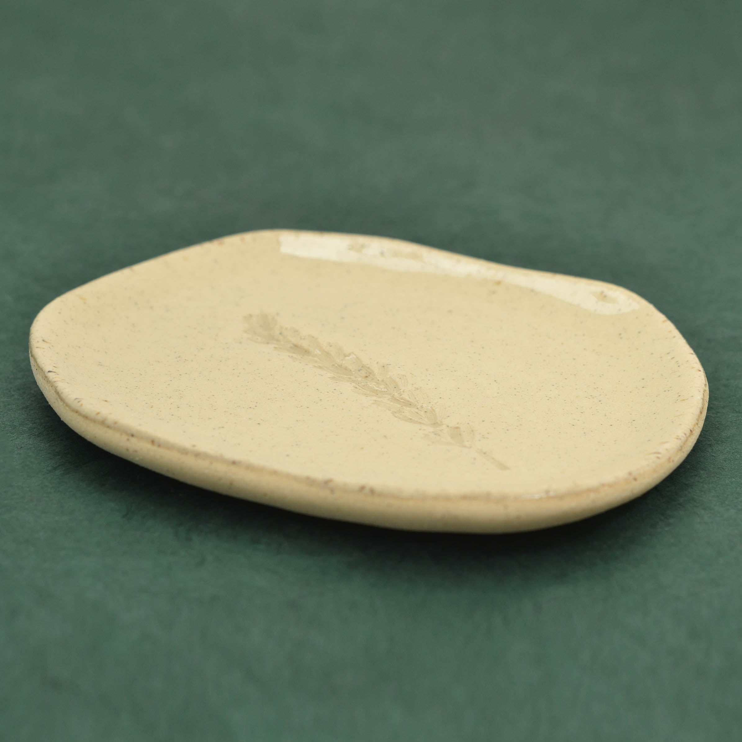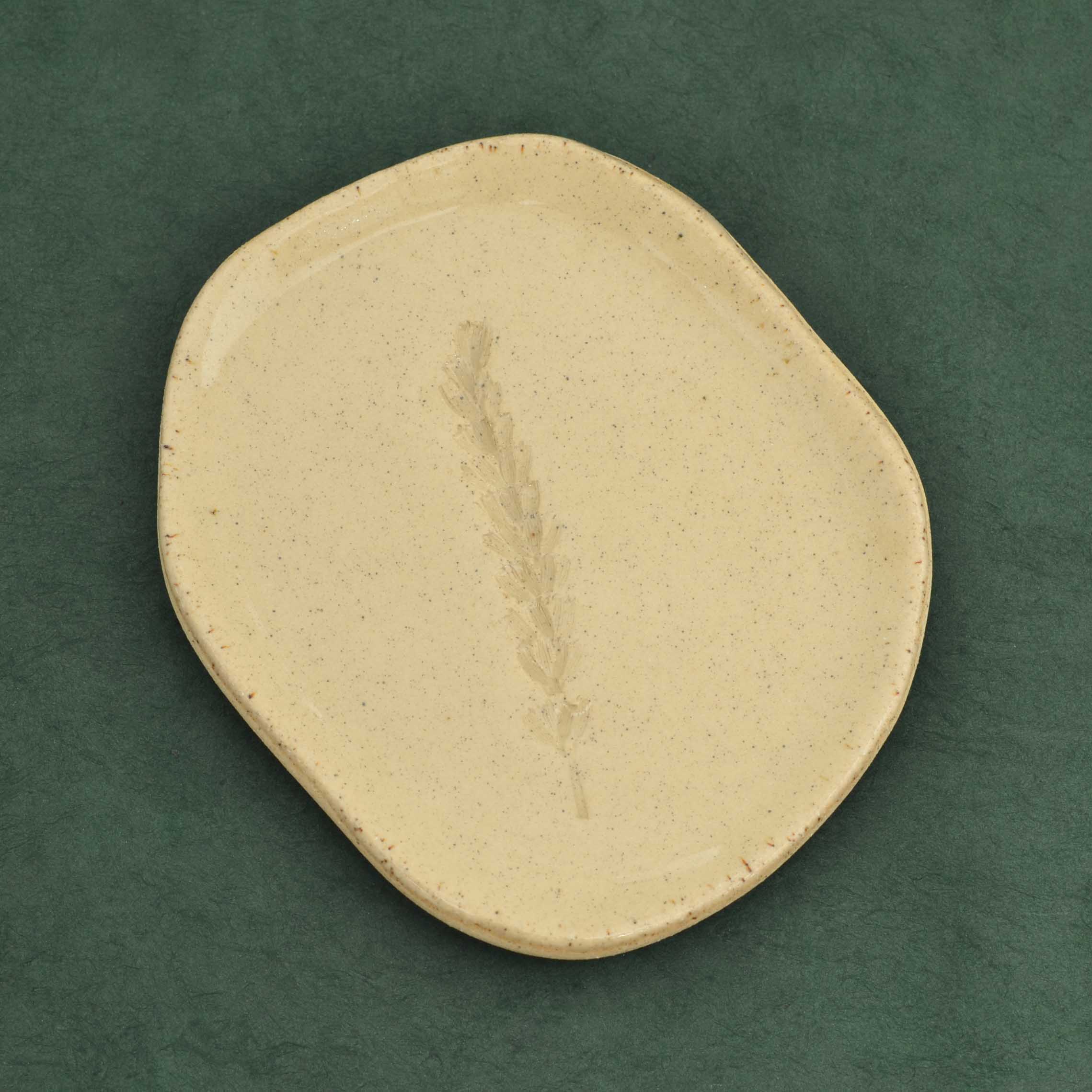 Délicate coupelle en porcelaine, émaillée d'un crème doux et naturel, façonnée à la main par la créatrice dans son atelier provençal. Cette pièce à la forme organique porte une empreinte de lavande, qui lui confère un charme authentique et un parfum de Provence.