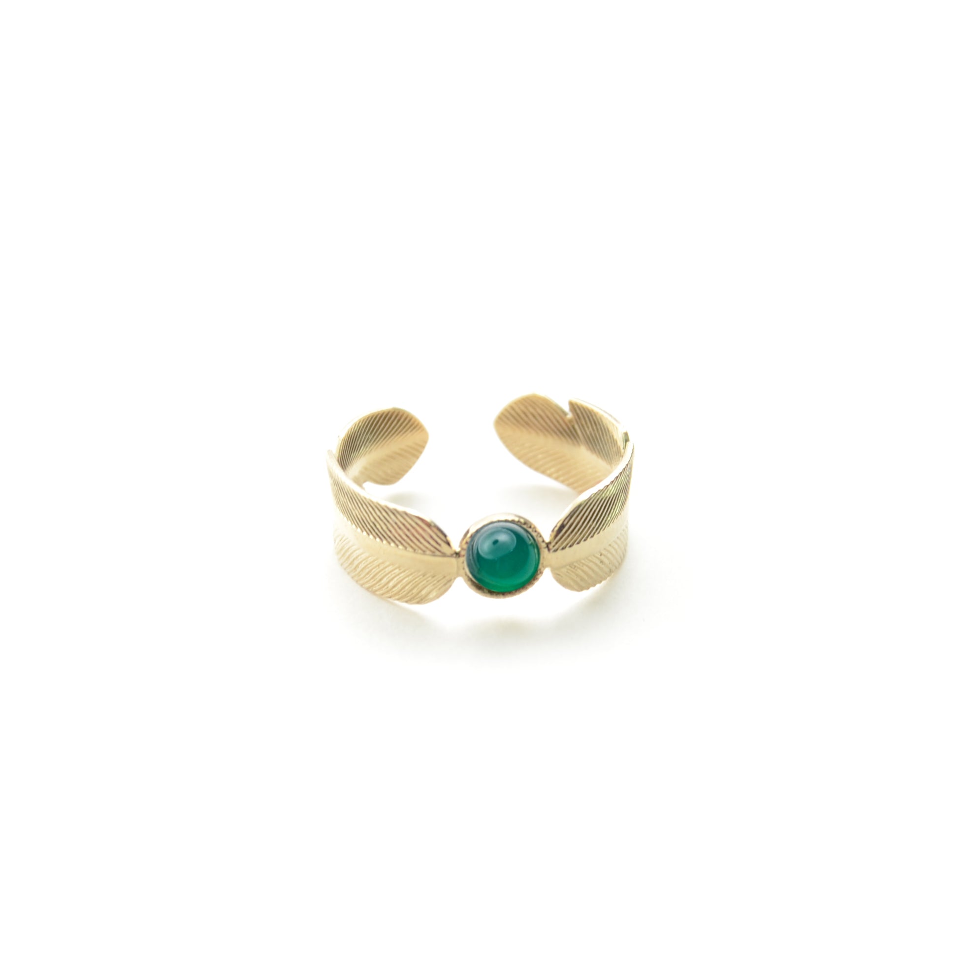 Ravissante bague au style ethnique chic, ornée d'une jolie pierre semi-précieuse et de plumes joliment travaillées. Ce bijou ornera votre main avec délicatesse et originalité.